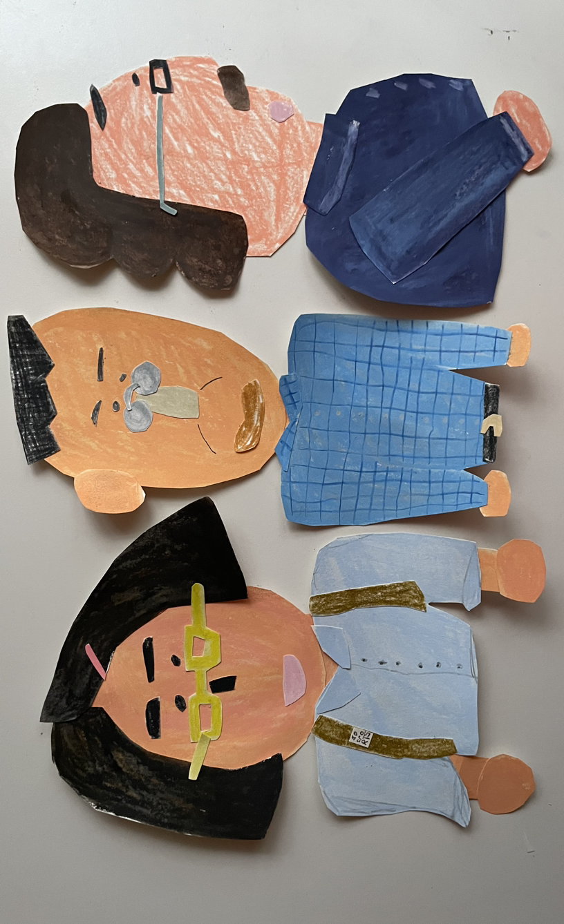 블루 와이셔츠들이 문에 비친다.