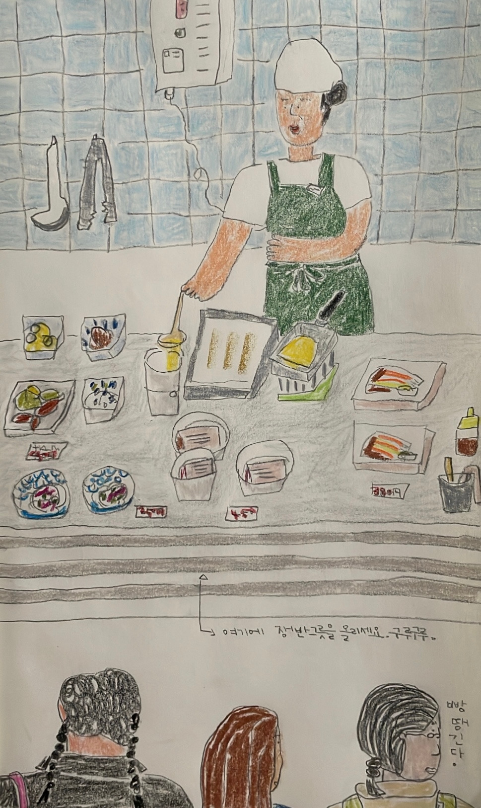 글을 쓰는 나는 빵파(조식으로 빵을 즐기는 타입)이지만 얌전히 따른다. 셋이 도착한 곳은 마치 반찬 컨베이너 벨트 같은 곳이다. 입구에서부터 줄지어 있는 반찬과 국, 밥을 고르면 고르는 만큼 값을 내는 그런 식당.