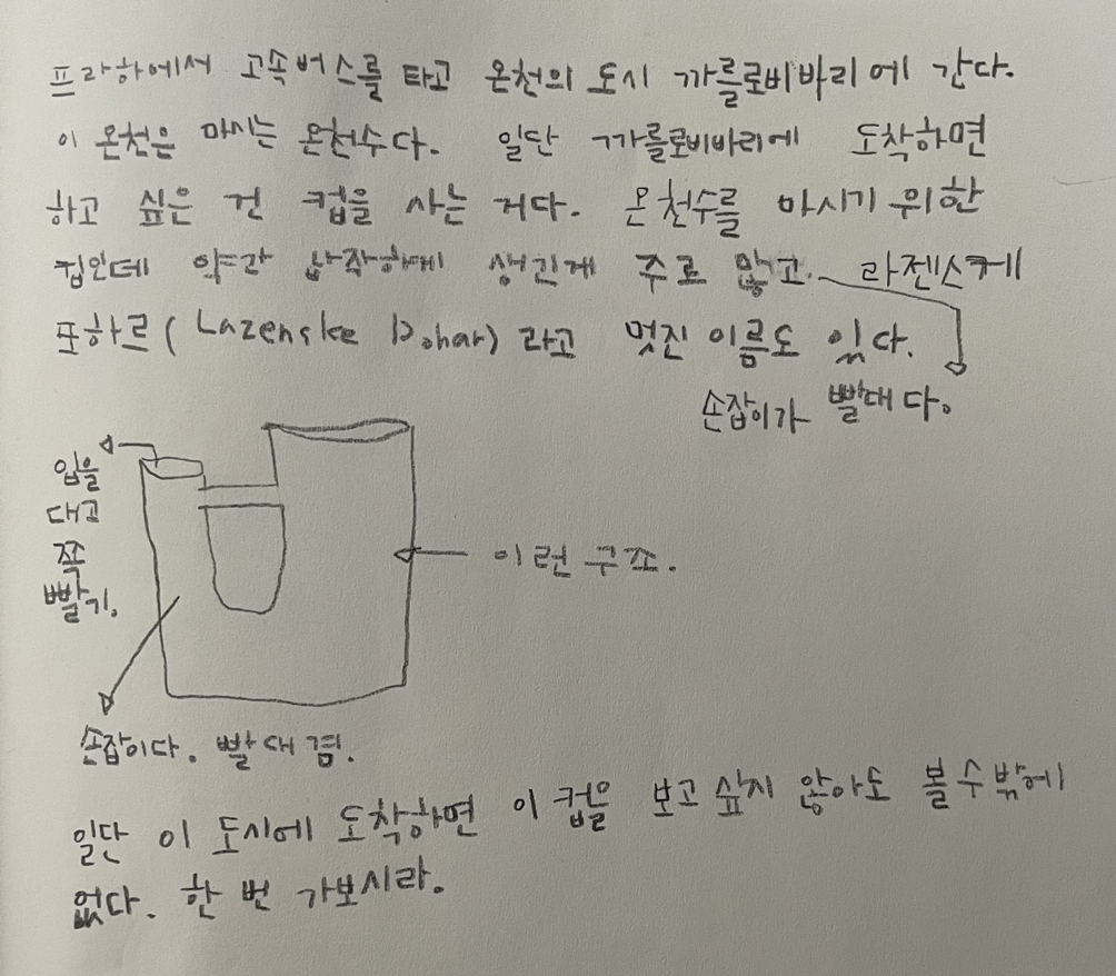 까를로비 바리에 오신 것을 환영합니다-하고 두 팔 벌려 반겨주는 건 벌들이다. 유럽에는 벌이 많다.(유럽이라지만 가본 곳은 파리, 프라하 이렇게 두 곳) 버스에서 내린 나와 동생은 배가 고파 피자와 파스타를 먹는다. 그런데 벌들이 무섭게 같이 먹자 달려든다. 어째 나보다 벌이 더 잘 먹고 있는 기분이다. 그런데 벌 때문에 요란을 떠는 건 나와 동생뿐. 옆자리 테이블에도 벌이 잔뜩이지만 다들 소-쿨하게 식사 중이다. 입으로 들어가는 게 파스타인지 벌인지 모르겠는 식사를 마치고 라젠스케 포하르를 사러 간다.