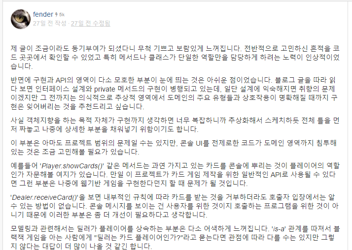 후기외에도 OKKY에는 많은 선배님들이 계셔서 내가 정확하게 공부를 한 것인지, 올바르게 코드를 작성한 것인지 리뷰를 받을수 있었다.