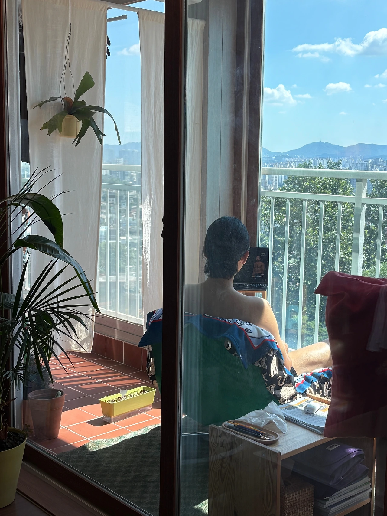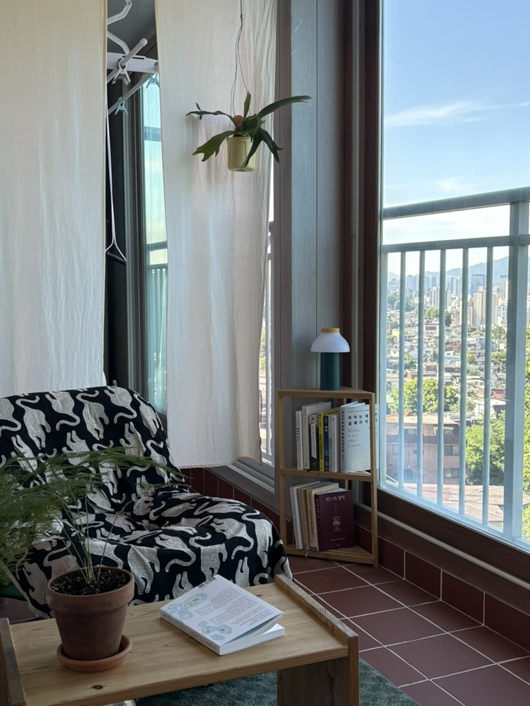 비록 외창이 뚫린 테라스는 아니지만, 베란다로도 충분히 그 욕구는 채우고 있다. 밖에서 책을 읽기도 하고, 글을 쓰기도 한다. 커피 한 잔 마시며 멍 때리기에는 더할 나위가 없다. 최근에는 태닝을 시도하기도 했다. 창으로 자외선이 차단돼서 그런지 별로 효과는 없는 것 같지만.