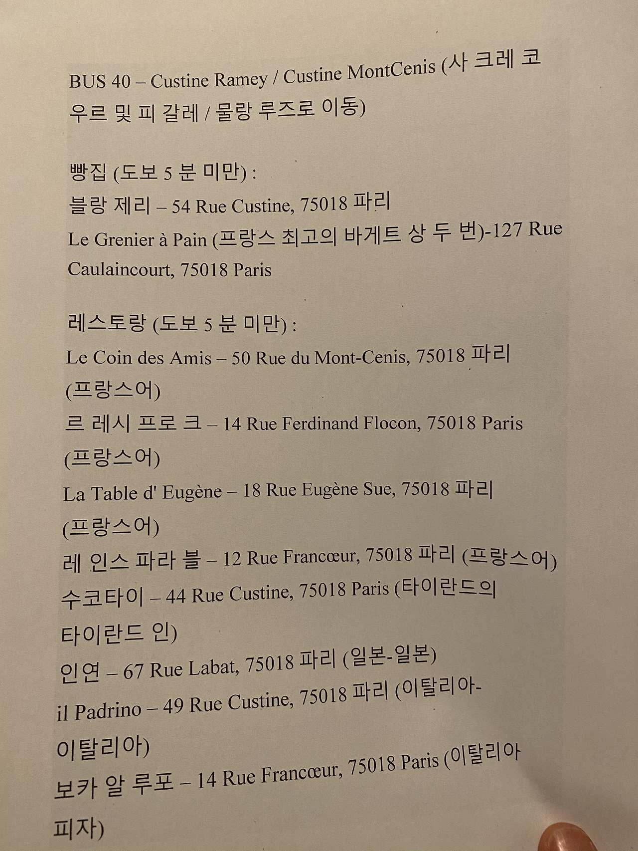 세수를 하고 유심 문제를 해결하고 프로듀싱 중인 작품 원고를 보다가 졸음이 쏟아져 잠깐 눈을 부쳤는데 방 바깥에서 소리가 나 whatsApp 을 보니 호스트의 메시지가 와있었다. Laurent를 만났다. 그는 훤칠하고 건장한 호남형 남자였다. 그에게 세탁기 사용법, 주방 이용법 등 보다 자세한 안내를 받았고, 교통, 음식 등 주변 인프라에 대한 문서도 받고