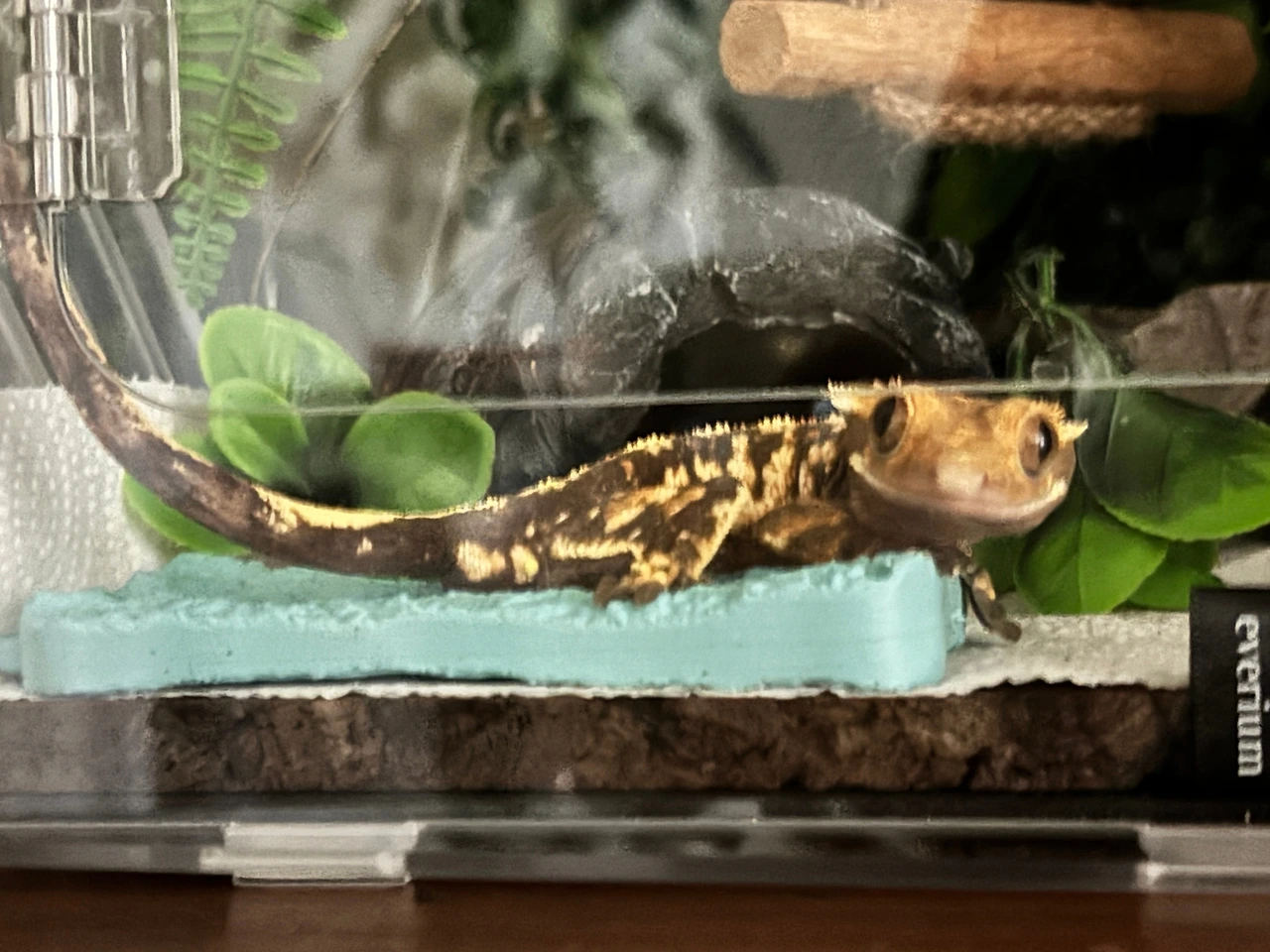 "볏도마뱀붙이"의 영어 이름인 "Crested Gecko"주로 반려 파충류로 인기가 많은 도마뱀입니다. 주요 특징으로는 볏(크라운) 모양의 피부 돌기가 머리 양옆에 특징적으로 나 있어 '볏도마뱀붙이'라고 불립니다. 비닐이 빽빽하고 부드러우며, 물에 잘 젖지 않는 것이 특징입니다. 야행성이며, 다양한 색상과 무늬가 있어 관상용으로 많이 키웁니다.