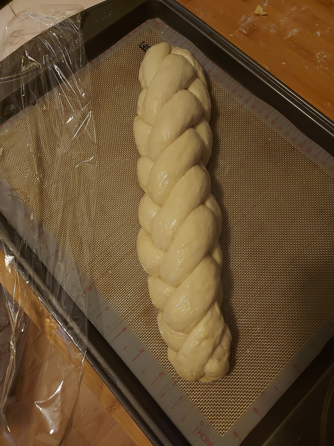지금까지 내 챌린지를 하면서 비주얼은 포기하고 맛으로 밀어붙였다면 이번에야말로 만회할 기회라고 생각했다. 그런데 머리땋기에 소질 없는 내가 빵이라고 다를까. 처음부터 여섯 가닥으로 만들려다 질퍽한 반죽 가닥들이 서로 들러붙어서 울퉁불퉁한 커다란 빵덩어리가 되어있었다. 이 빵은 비주얼이 반인데 여기서 포기할 수 없었다. 다시 둥글리기를 하고 휴지기를 가지고 다섯 가닥으로 도전! 하나하나 천천히 다시 해보니 이렇게 예쁜 빵이 되었다. 그리고는 문득 디스코땋기 장인인 엄마가 만들었다면 더 예쁘게 되었을까 하는 생각이 들었다.