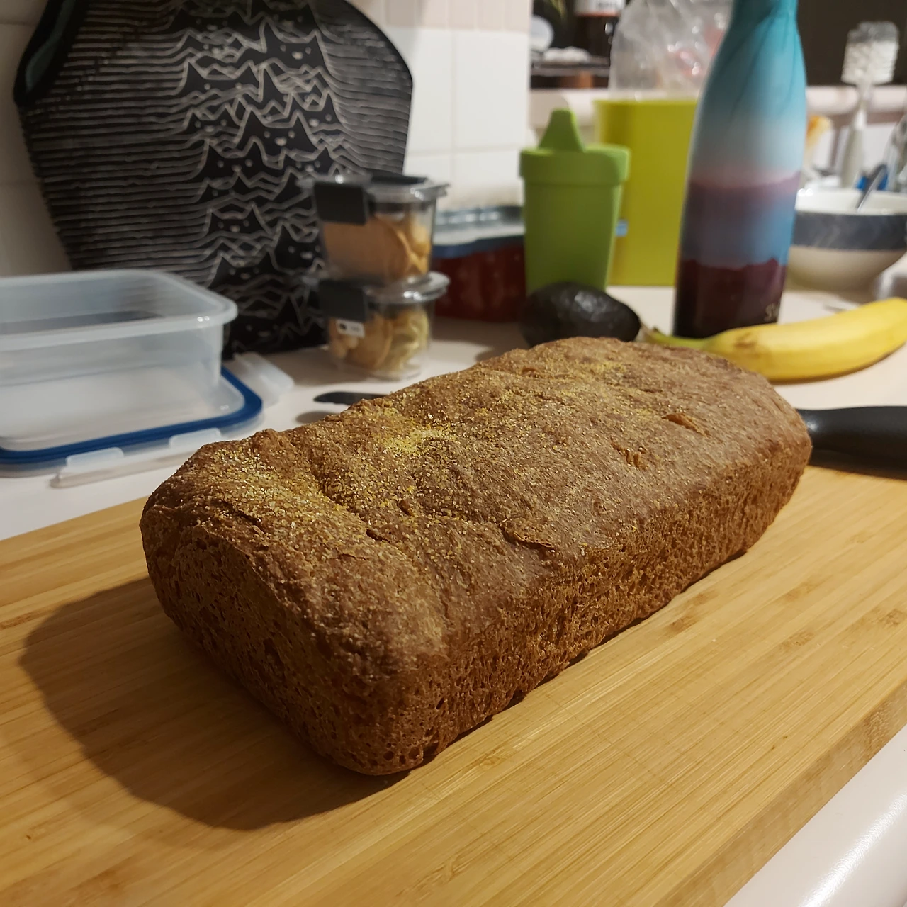 먼저 콘밀을 물에 불려 두어야 하는데 밤 9시가 넘어서 부랴부랴 시작했더니 어쩔 수 없이 소파에서 조각잠을 자고서 12시에 넘어 냉장고에 넣어두고, 다음날 빵을 만드는 날. 2박 3일 출장을 간 남편을 대신해서 아이를 돌보랴, 밥 하랴, 빵 만들랴 마음이 급해져서 포실포실하게 2차로 잘 발효된 빵에 살짝 달라붙은 랩을 떼어내다가 발효가 푹 꺼져버렸고, 그냥 반신반의하면 구운 내 첫 빵은 벽돌처럼 납작해져서 볼품없어져 버렸다. 빵이 생각보다 부풀지 않아서 오래 발효했던 것이 화근이었던 것 같다.