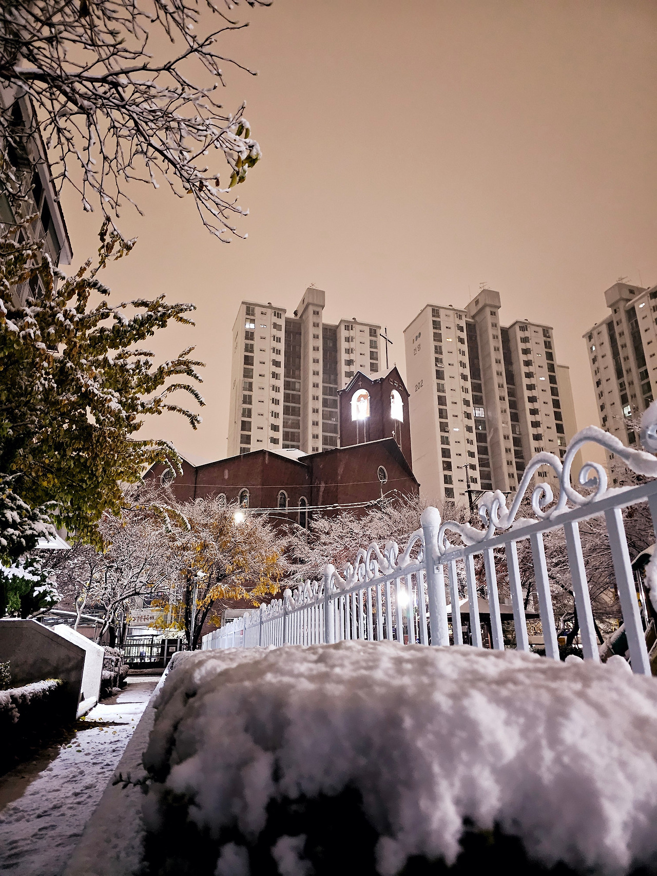 그러고 보니 내가 출근 걱정할 일은 없습니다. 출근하지 않아도 되는 백수니까 말입니다. 나는 그저 내리는 눈을 창문 열고 감상하고 그 감상으로도 부족하여 아파트 뜰로 내려가 첫눈을 밟아봅니다. 지구표층의 자연현상을 각자의 눈과 각자의 귀로 보고 듣습니다. 지금 나는 눈을 밟아 첫 발자국을 내보고 그 흔적을 휴대폰 사진 속으로 담아냅니다. 첫눈 내리는 아침의 풍경입니다.