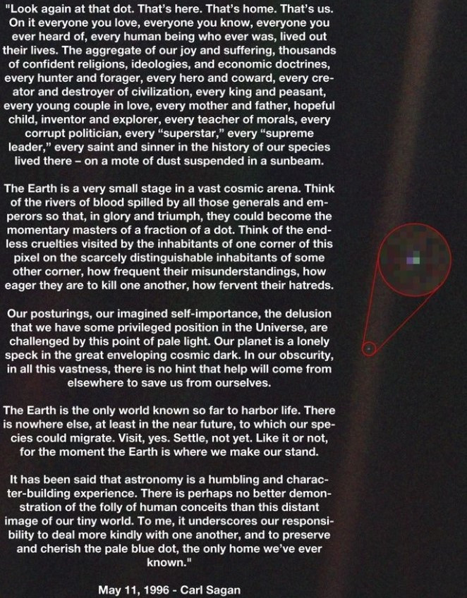 "저 작은 점을 다시 보라. 저곳에 모든 것이 있다. 저 것이 우리의 고향이다. 저 것이 우리다. 이곳에서 당신이 사랑하는 모든 이들, 당신이 알고 있는 모든 사람들, 당신이 들어봤을 모든 사람들, 예전에 있었던 모든 가람들이 그들의 삶을 살았다. 우리의 모든 즐거움과 고통, 확신에 찬 수많은 종교, 이데올로기, 그리고 경제정책, 모든 사냥꾼과 약탈자, 모든 영웅과 겁쟁이, 문명의 모든 창조자와 파괴자, 모든 왕과 농부, 사랑에 빠진 젊은 연인들, 모든 아버지와 어니, 희망에 찬 아이들, 발명가와 탐험가, 모든 도덕의 스승들, 모든 타락한 정치인들, 모든 슈퍼스타, 모든 최고 지도자, 인간 역사의 모든 성인과 죄인들이 여기 태양의 빛 속에 부유하는 먼지 티끌 위에서 살았다.