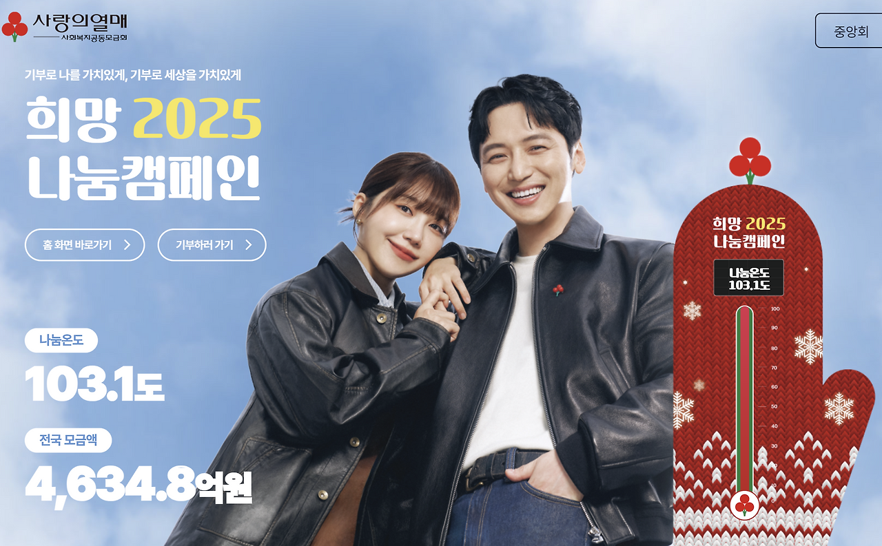 사랑의 열매 사회복지공동모금회에서 진행하는 '희망 2025 나눔 캠페인'은 지난 12월 1일부터 시작해 1월 31일까지 두 달간 전국 17개 시도지회에서 일제히 전개 중이다. 이번 캠페인의 나눔 목표액은 4,497억 원으로 지난해보다 3.4%로 늘어난 목표치였다. 사랑의 온도탑은 목표액의 1%에 해당하는 금액이 모일 때마다 1도씩 올라간다.