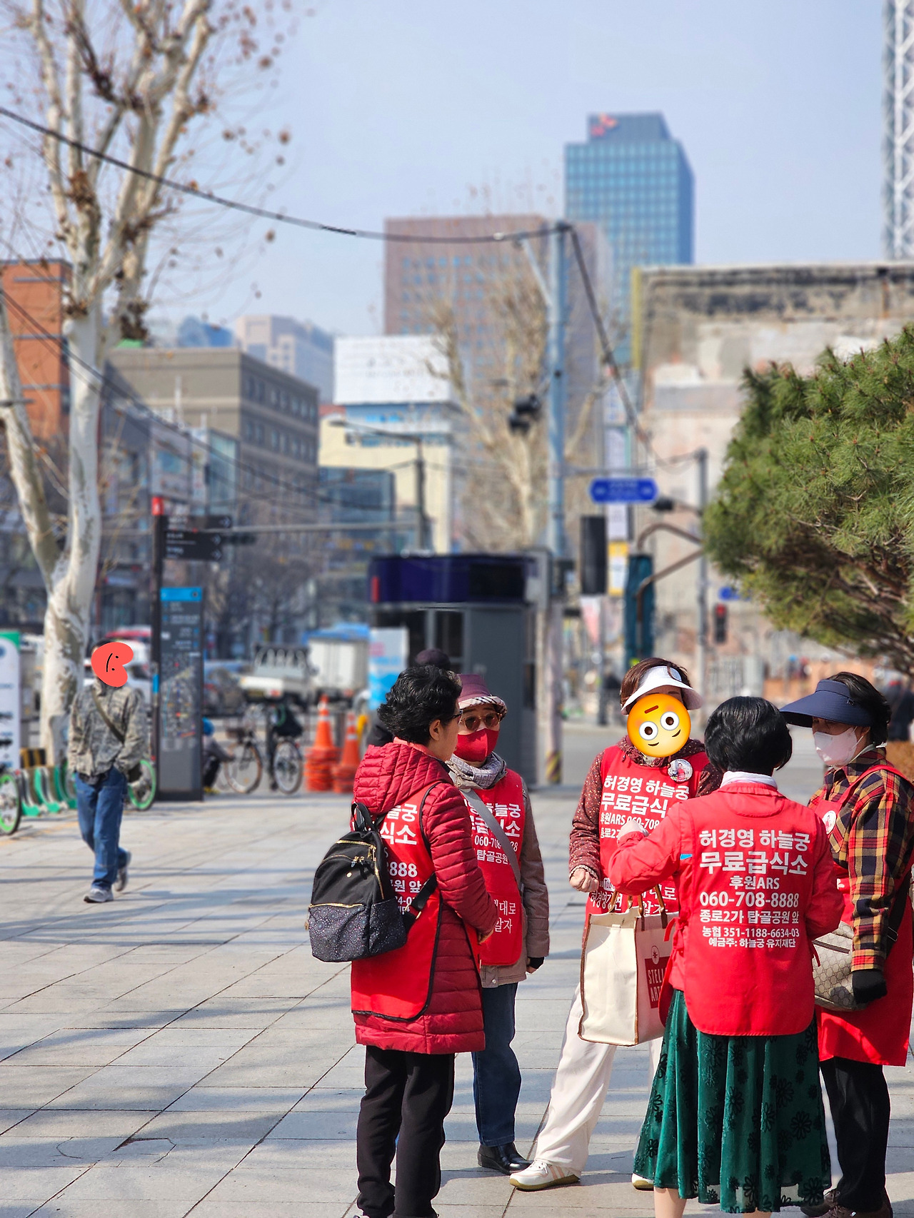 정문으로 나오자 똑바로 걸어갈 수 없을 정도로 어르신들이 가득하다. 공원 벽으로 사람들이 줄을 서있는 모습도 눈에 들어오고 멀리 빨간색 앞치마를 두른 무료급식소 운영 자원봉사자들의 모습도 보인다. 점심때 무료 도시락을 나눠주는 듯하다. 아직은 시간이 안돼 준비를 하는 모습인듯하다.