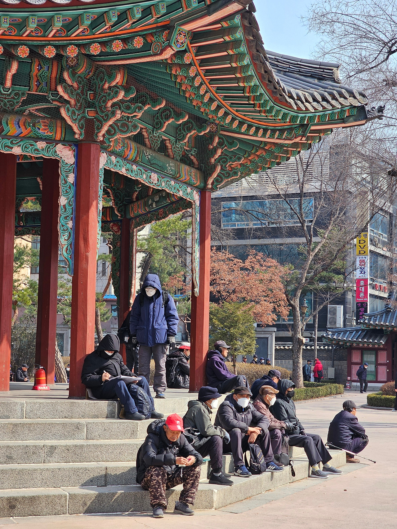 원각사지 10층석탑에 새겨진 아름다운 부조의 모습을 올려다보기도 전에 서둘러 발걸음을 정문으로 향한다. 공원 중앙에 있는 팔각정 계단에서, 여행을 온 일본인 처자 2명이 밝은 얼굴로 사진을 찍고 있다. 저 웃음과 어르신들의 좀비 같은 얼굴 표정이 전혀 다른 세상의 양면을 보여준다. 젊음과 늙음의 차이인가?