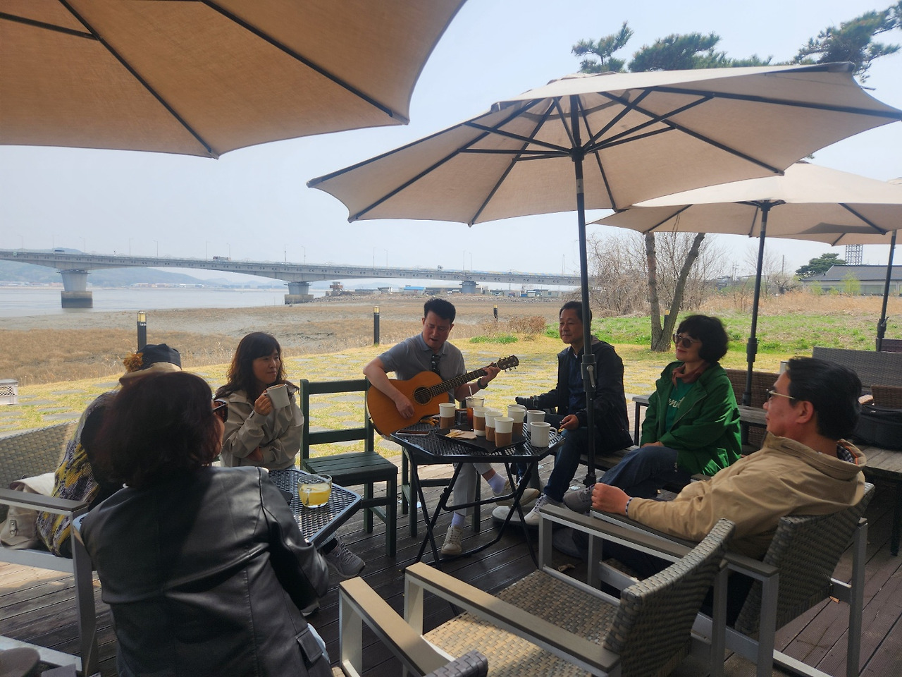멤버 중 가장 연장자 분께서는 새벽 1시 반에 기상하시어 멤버 숫자에 두 배나 되는 계란을 삶고 사과도 깎고 주전부리 과자도 한 보따리 챙겨 오셨다. 통기타의 추억을 간직한 세대의 모임이기에 기타도 챙겨서 초지대교가 건너다 보이는 뷰가 멋진 카페의 야외 파라솔 아래서 커피와 함께 노래도 불러 젊은 시절의 감흥도 되살렸다.