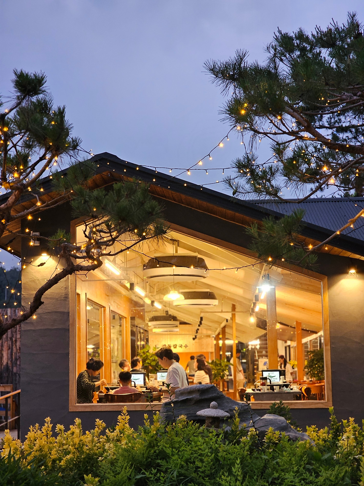 이 식당은 통창 건너 허브천문공원을 차경(借景)으로 삼고, 식당 정원에 물의 반영으로 건물을 돋보이게 하는 물의 정원이 있고 넓은 잔디밭에 파란색 파라솔 벤치가 놓여있다. 칼국수집 조경과 외관으로는 럭셔리하지만 그렇다고 화려해 보이지도 않는다. 검이불루 화이불치(儉而不陋 華而不侈 ; 소박하지만 누추하지 않고 화려하지만 사치스럽지 않다)의 전형이다. 식사공간이 갖는 의미는 특별하다. 같은 칼국수를 먹어도 분위기가 맛을 지배할 수 있음을 보여준다. 자연을 안고 먹는 한 끼는 단순한 식사를 하나의 ‘경험’으로 만들기 때문이다.