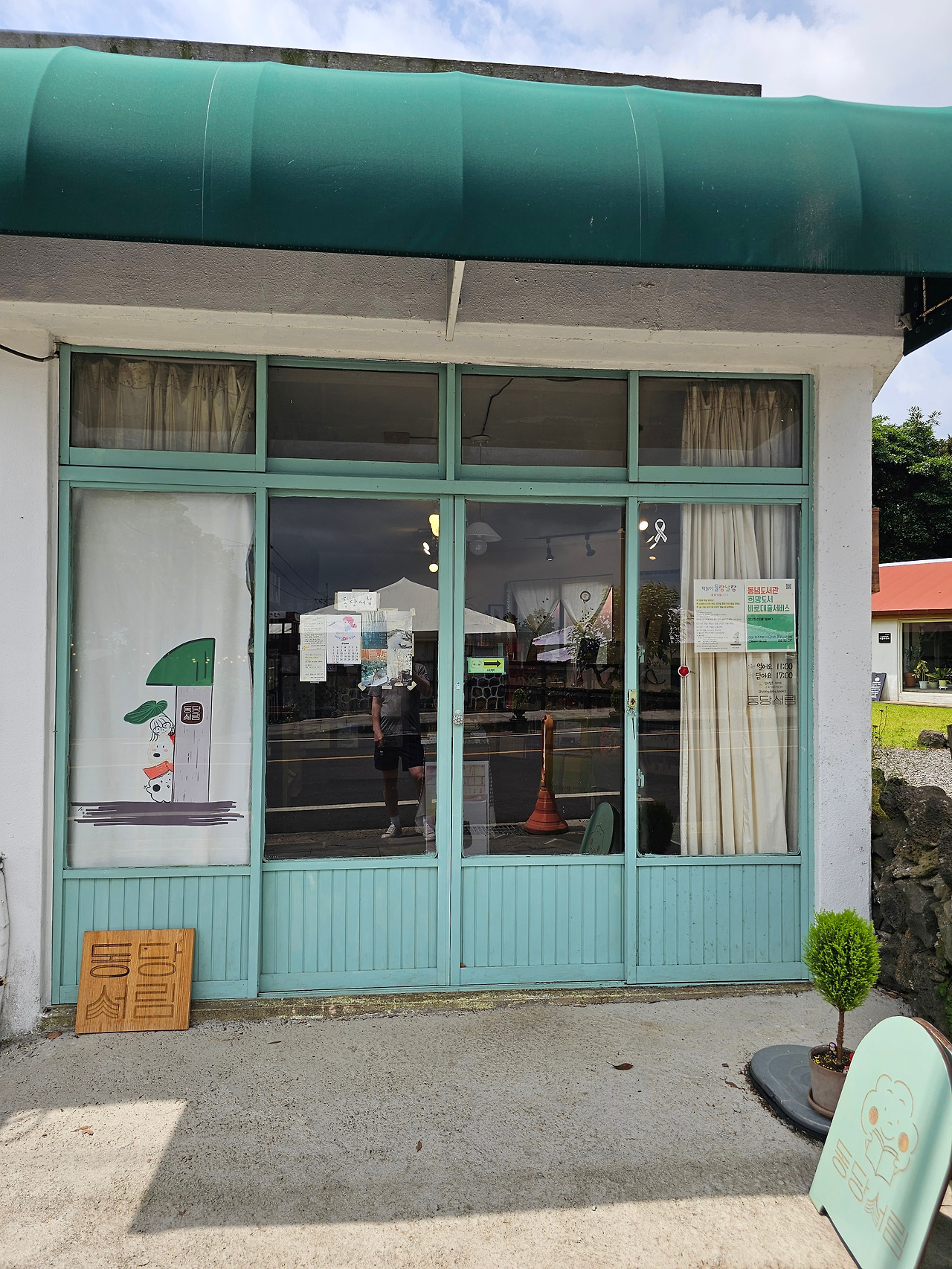 어제도 아침 운동으로 숙소 근처의 '당오름'에 올라갔다 내려오며 일찍 문을 연 소품 샵 몇 군데를 들어가 봤다. 여성 취향의 다양한 소품들로 꾸며진 곳들이라 전시된 상품들이 내 눈에는 들어오지는 않는다. 하지만 아기자기함이나 칼라플한 전시며 가게마다 나름 개성 있는 물건들임은 한눈에 알아챌 수 있다. 와이프와 큰 딸아이는 소품 샵에 들를 때마다 작은 물건 하나씩을 산다. 그래봐야 작은 화분이랑, 예쁜 키 링 그리고 기념품 정도다. '송당의 아침'이라는 작은 베이커리에서 빵도 두 개 정도 사본다. 하루 종일 움직일 텐데 간식거리로 먹을 요량이다. 그리고 들른 곳이 '동당서림'이라는 정말 작은 책방이다. 이번 여행에 처음 묵었던 산방산 밑에도 '어떤 생각'이라는 동네 책방에 들른 적이 있었는데 이곳은 더 작은 책방이다.