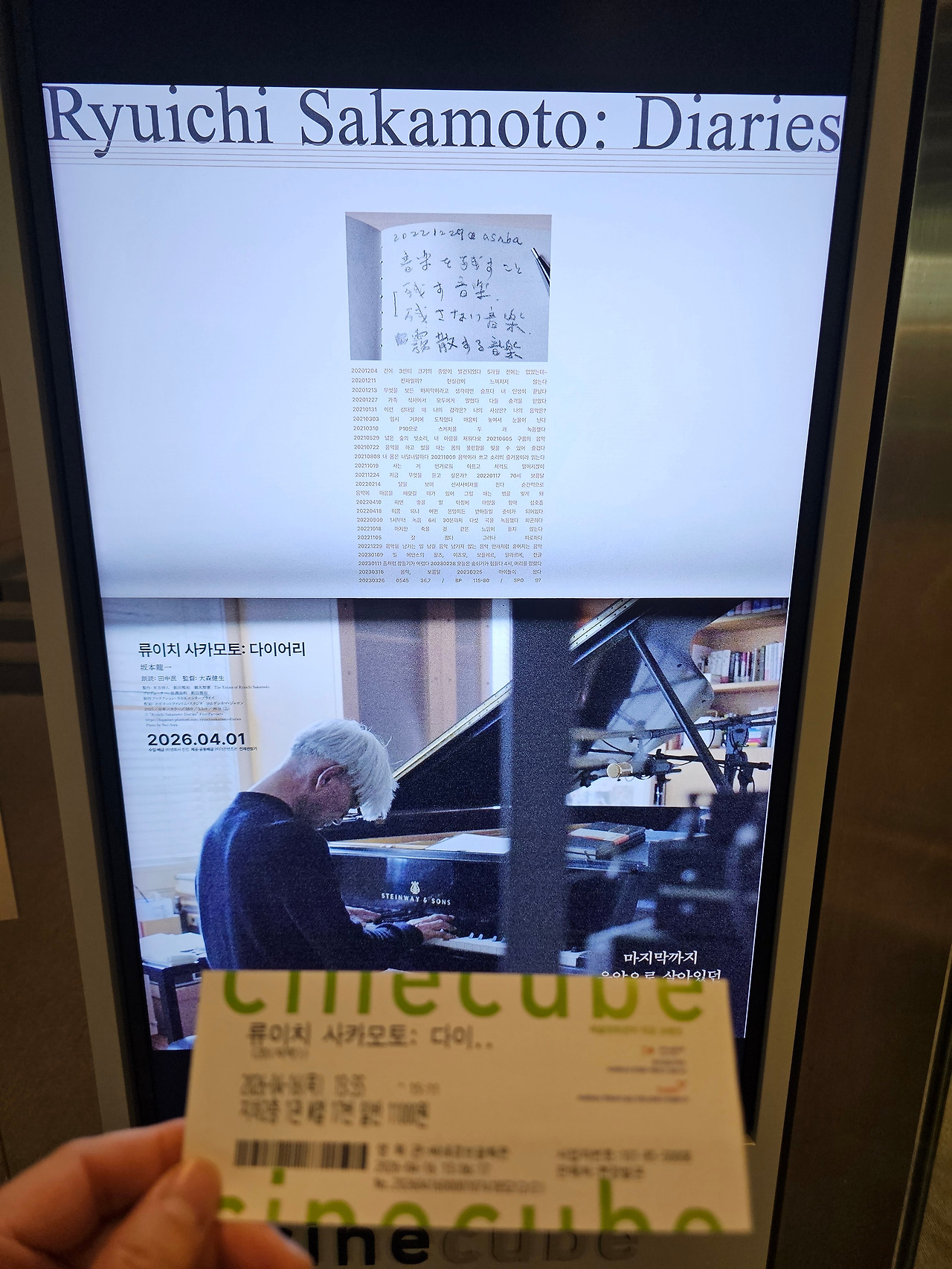 2주 전, 개봉관에 잠깐 모습을 드러냈다가 일주일 만에 사라진 영화가 있다. '류이치 사카모토: 다이어리(Ryuichi Sakamoto: Diaries)'라는 다큐멘터리 영화다. 어제 예술영화 전문 상영관인 광화문 시네큐브에서 그 영화를 봤다. (같이 영화보러 갈 사람, 손 드시오! https://brunch.co.kr/@jollylee/1300 )