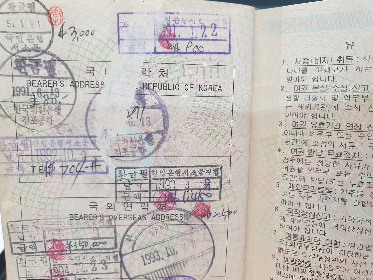그리고 여권을 넘기다 웃음 짓게 만드는 도장 날인들을 보게 된다. 여권 맨 뒤에 은행에서 환전을 하면 환전한 금액을 여권 뒤에 써서 확인한 도장이 있다. 얼마를 환전해서 출국했는지 알 수 있는 것이다. 여권에 1997년까지 환전 도장이 찍혀 있는 것을 보니 90년대 후반까지도 그랬던 모양이다. 이 환전한 액수 표시를 보고 여행사 인솔 가이드들이 데리고 갈 팀들의 현금 보유량을 알 수 있어 쇼핑 상점을 어디로 인도할지 지표로 삼았다는 웃지 못할 사연들도 있다.