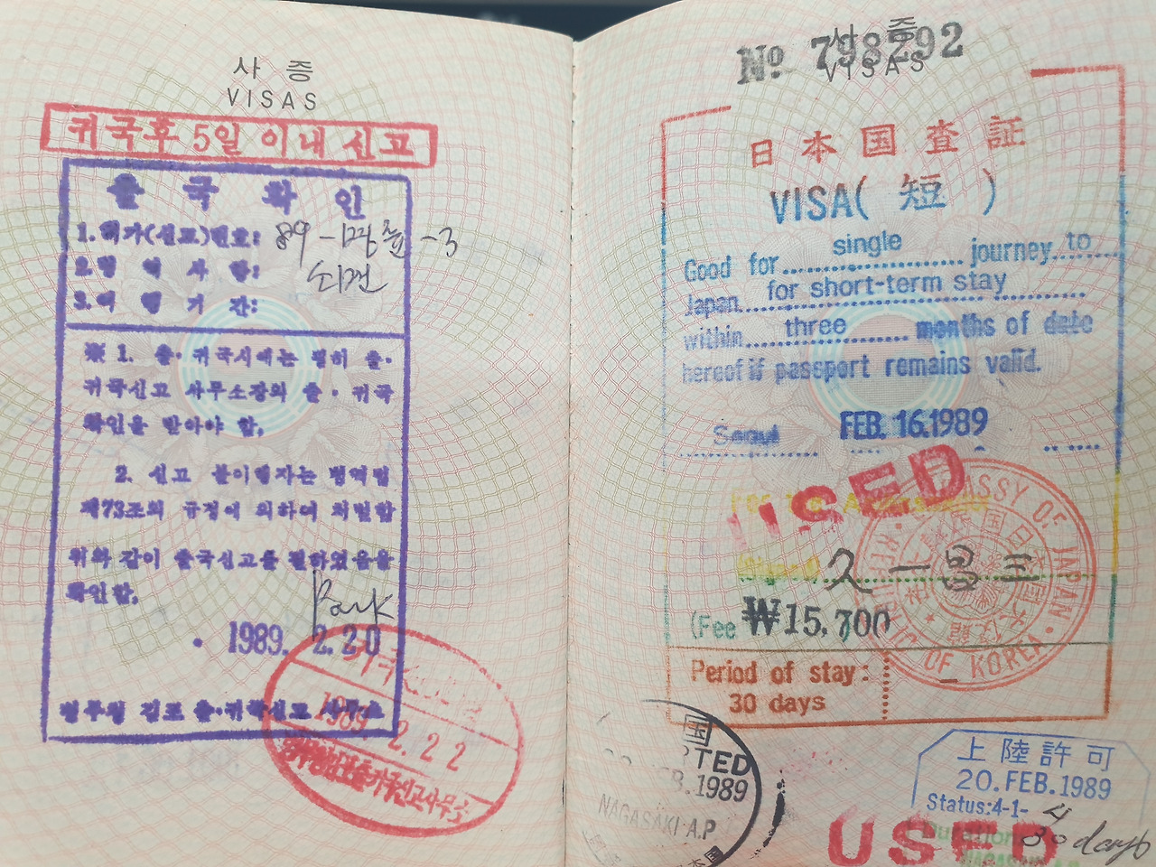 맨 처음 만들었던 여권을 펴보았다. 1989년 2월 16일, 5년짜리 일반여권으로 발급받았다. 일본 규슈로의 여행이 나의 첫 해외여행이었다. 당시에는 일본 입국 비자가 필요했던 시절이라 유효기간 3개월짜리 비자를 일본대사관에 가서 받았다. 여권 속에 찍혀 있는 비자 중에는 유독 미국 비자만 3개가 찍혀 있다. 사연이 있다.
