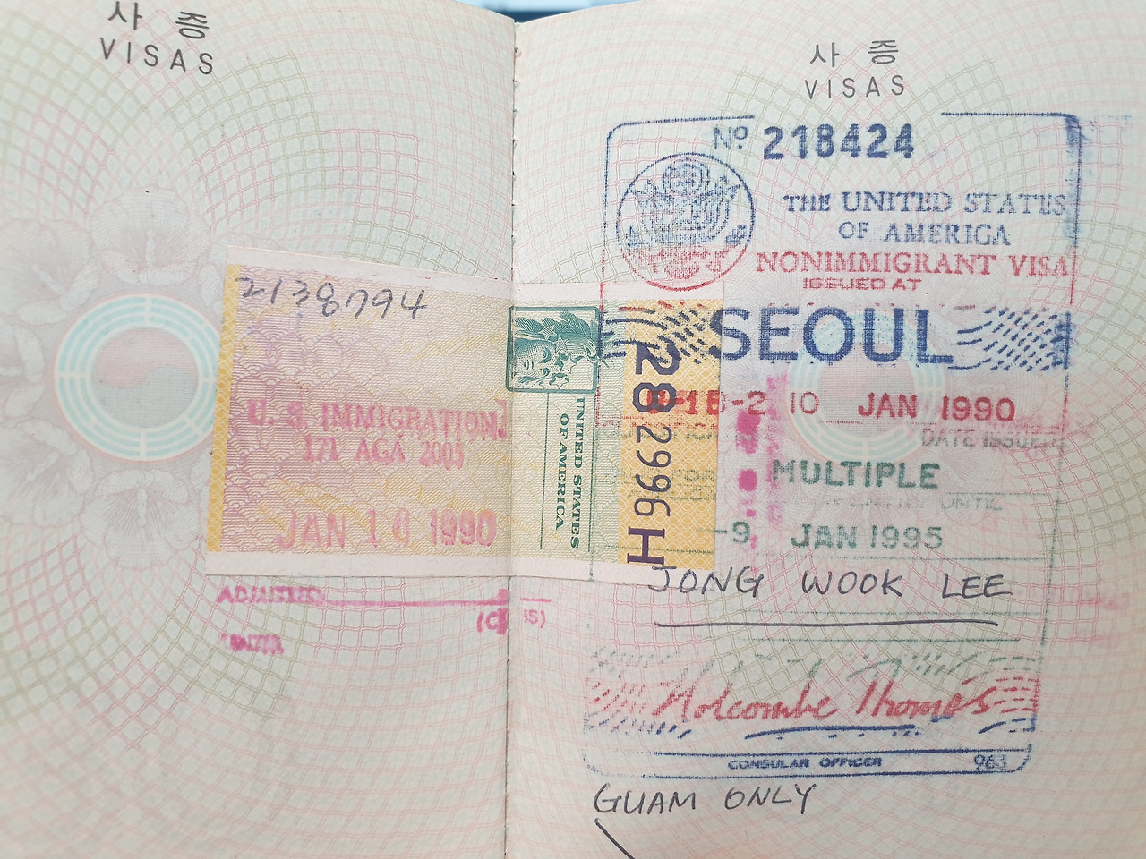 그렇게 해서 받아 든 B1 B2 관광용 미국 비자의 끝에는 수기로 Guam Only라는 꼬리표를 달았다. 추운 겨울밤을 지새우며 줄 서서 비자를 받았는데 괌만 들어갈 수 있는 비자를 주다니 ㅠㅠ. 양키들에 대한 적대감이 끓어올랐지만 힘없고 빽 없는 변방 대한민국의 청년으로서는 그저 감내해야 할 낙인으로 받아들였다. 그리고 다음 해인 1991년 본토인 LA에 갈 일이 생겨 다시 대사관 앞에 줄을 서야 했다. 그래서 미국 비자가 2개가 됐고 또 하나는 비자 유효기간이 끝나서 갱신하느라 1996년에 재발급받은 10년 유효기간의 비자가 있다. 지금은 이 마저도 유효기간이 종료되고 갱신을 하지 않아 쓸모없는 것이 되어버렸지만 2008년 말부터 미국과 비자면제 프로그램이 가동되면서 ESTA 전자여권 비자 신청으로 바뀌어 여권에 비자를 받지 않아도 되어 편해졌다.