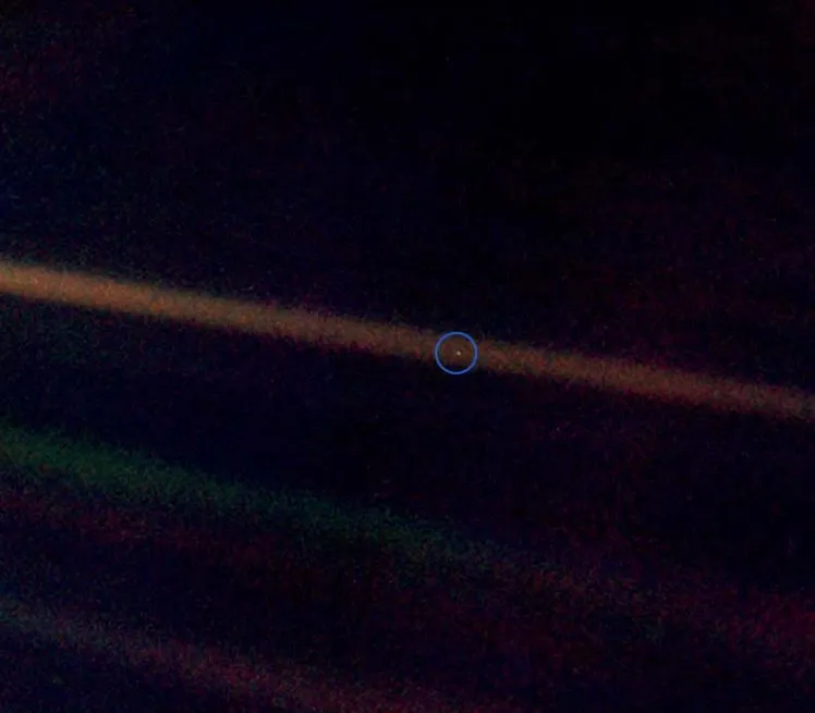 1990년 2월, 보이저 1호가 태양계를 벗어나는 끝 지점에서 카메라를 지구로 돌려 지구의 모습을 찍었다. 칼 세이건이 당시 보이저 계획의 화상 팀을 맡았는데 세이건의 주도로 촬영된 유명한 사진이다. '창백한 푸른 점(The Pale Blue Dot)'이다. 사진에서 지구 크기는 0.12 화소에 지나지 않았다. 지구와의 거리 61억 km였다.