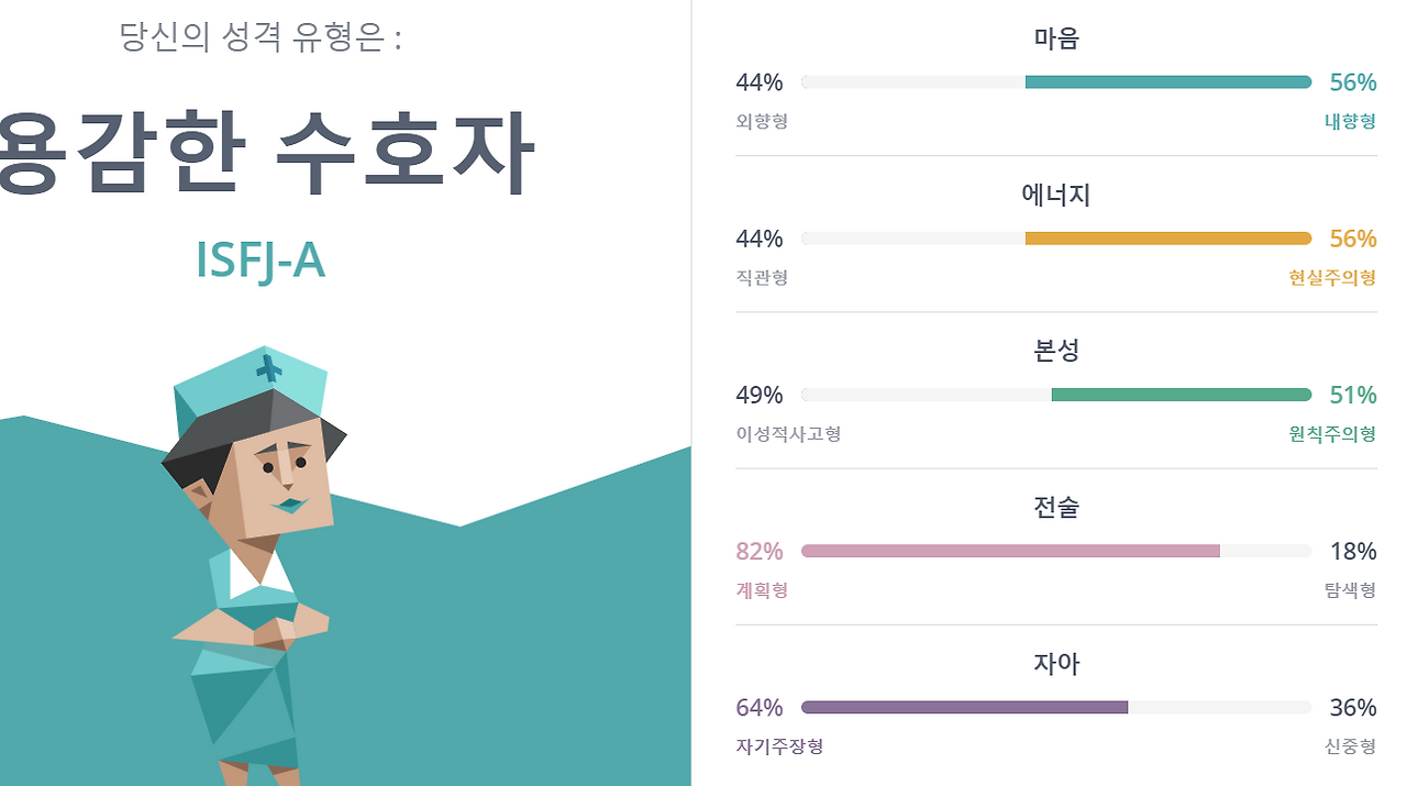 범주화된 성격을 너무 믿지 말자. 사람은 키메라처럼 여러 형상을 내재하고 있다. 어떤 예기치 못한 상황에 부닥치면 성격을 바꿔서라도 상황을 해결하게 되고 감추어진 다른 성향이 작동하게 된다. 내 안에는 모든 MBTI가 다 들어 있다. 지금 이 시간에 보여지는 MBTI는 ISFJ일 뿐이다.