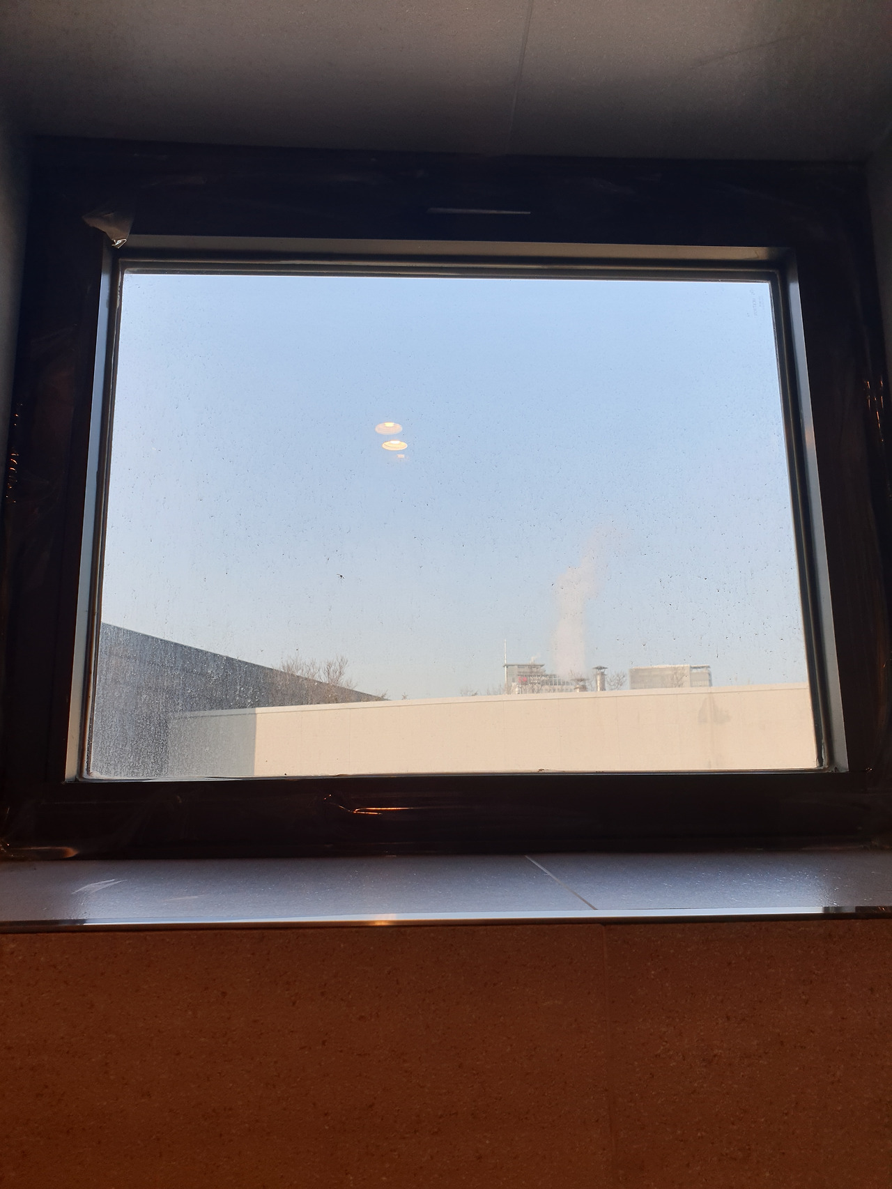 화장실 창문은 크지 않다. 가로 50센티 세로 50센티정도 되려나. 환기를 위한 보조용으로 안쪽으로 열리게 되어 있지만 손잡이가 높아 키가 닿지 않는 높이에 있다. 겨울에는 보온을 위해 창문틈 사이에 테이프를 붙여놓았다. 이중창 사이에 한여름에 들어갔을 모기 한 마리도 죽어서 붙어 있고 창문 바깥에 먼지들이 언젠가 빗줄기에 줄줄이 흘러내렸던 골을 보여주고 있다. 그 창 너머로 바깥풍경이 차경(借景)되어 있다.