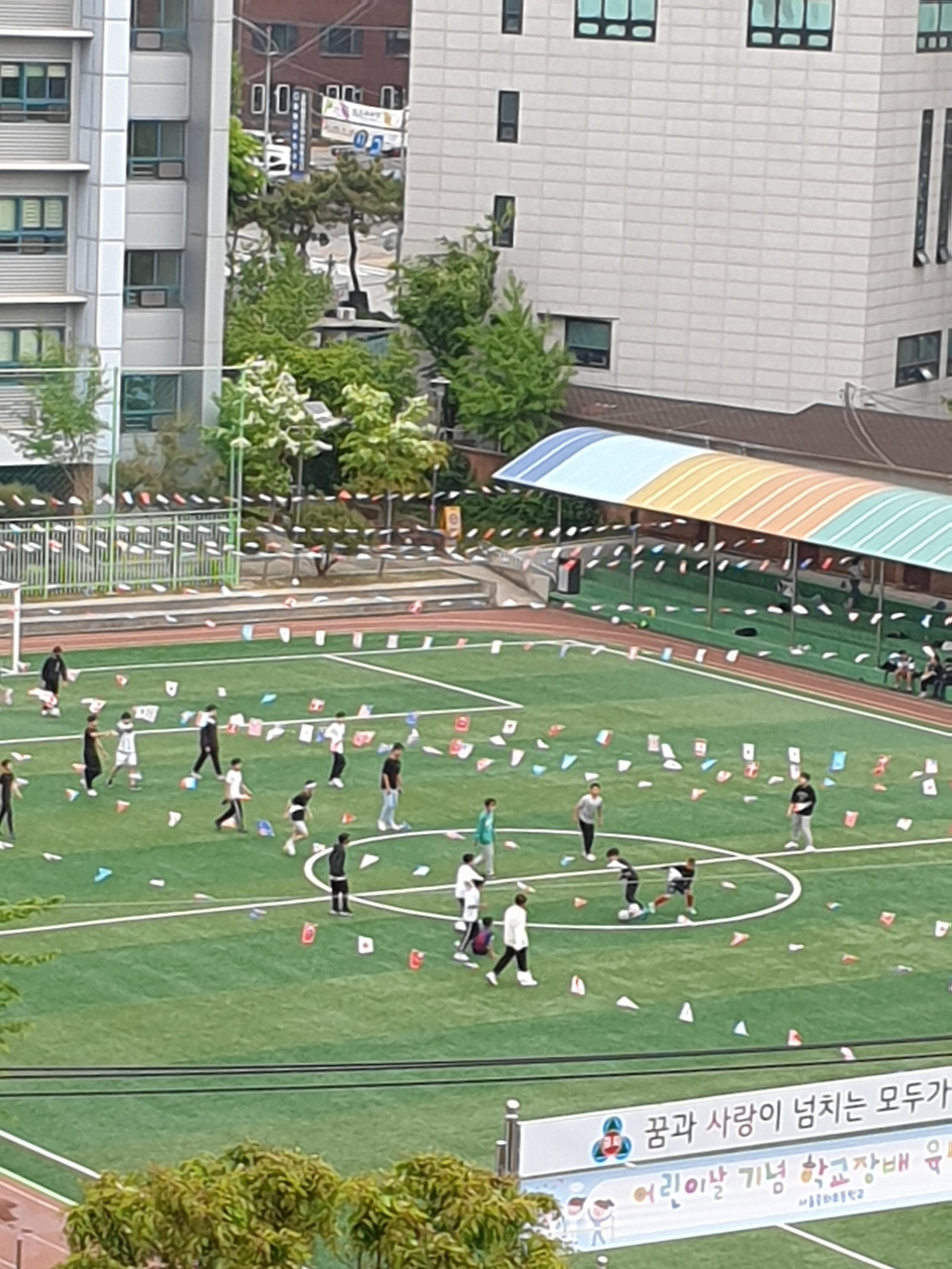 무언가를 하기 위해서는 분위기가 중요합니다. 국민학교 시절, 만국기가 걸린 운동장에서 흙먼지 풀풀 날리며 뛰어다니던 모습이 떠오릅니다. 오늘 내려다본 초등학교 운동장은 만국기 아래로 초록의 인공잔디가 깔려있습니다. 사각의 운동장 옆으로는 붉은색 우레탄이 깔린 달리기 트랙도 보입니다. 운동장 환경이 흙먼지 날리던 곳에서 깔끔하고 세련된 모습으로 바뀌어 있습니다. 하지만 그 안에서 뛰어다닐 학생들의 모습은 예나 지금이나 한결같이 같은 모습일 겁니다.