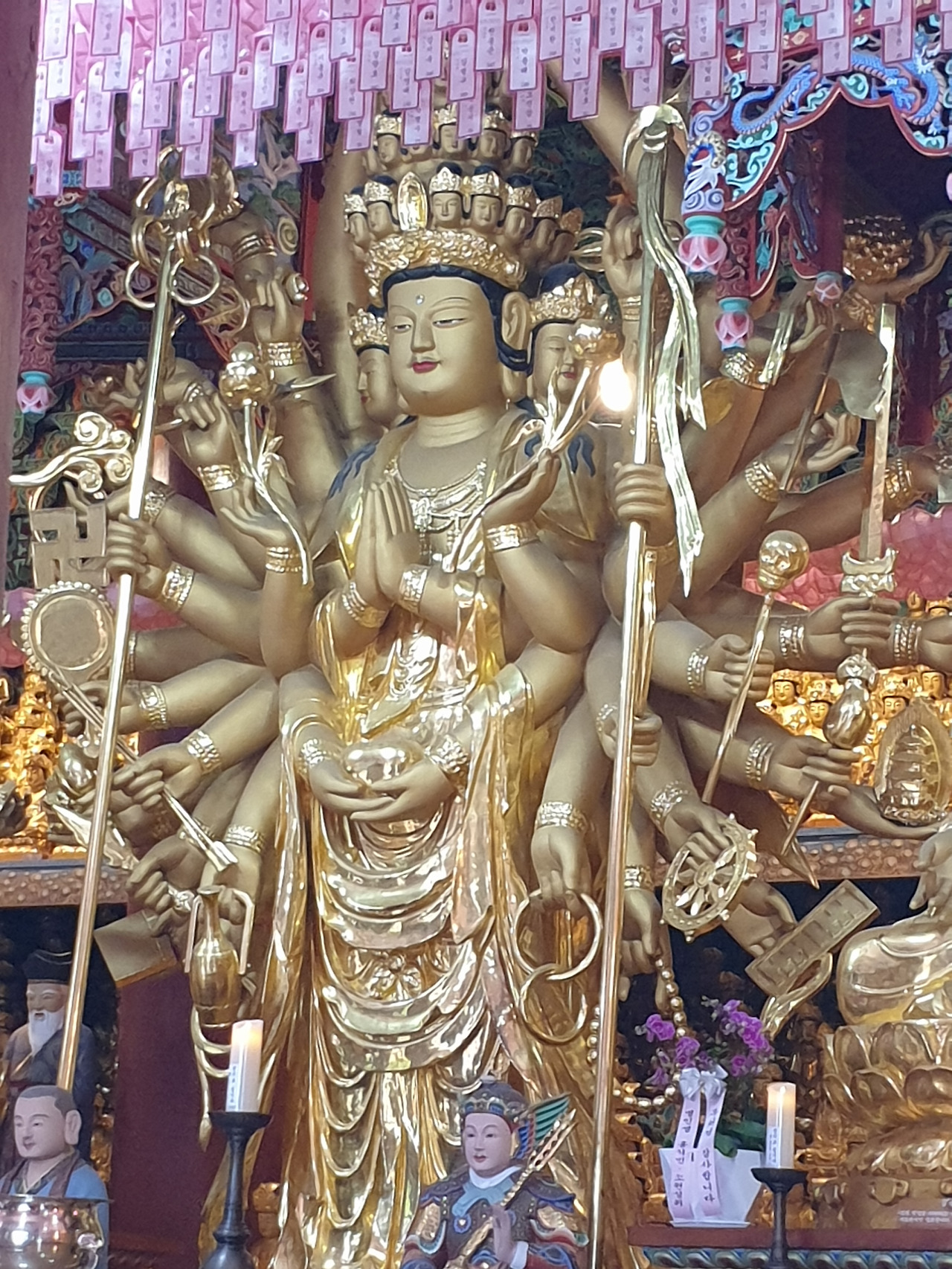 정면에 조성되어 있는 관세음보살상 앞에서 일곱 번 절을 하십니다. 걸음도 간신히 걸으시는 몸으로 어떻게 절을 저렇게 여러 번 할 수 있을까 의아해집니다. 일곱 번 절을 하시더니 다시 좌측과 우측 보살상을 향해 각각 일곱 번씩 또 절을 하십니다. 도합 21회나 됩니다. 신체 멀쩡한 저보고 그렇게 절을 하라고 해도 무릎이 시큰거릴 텐데 말입니다.