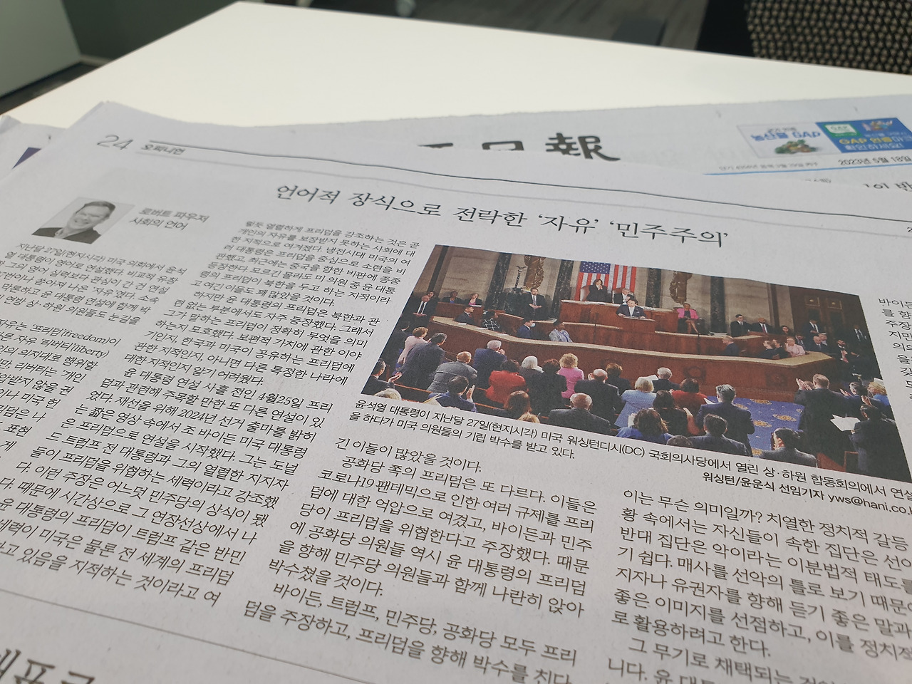 오늘 한겨레신문 오피니언면에 실린 언어학자 로버트 파우저가 쓴 '사회의 언어' 칼럼에 "언어적 장식으로 전락한 '자유' '민주주의'"에서도 같은 단어를 놓고 진영에 따라 바라보는 시각이 다름을 지적하고 있어 흥미로움을 더했다. 이 칼럼에는 "윤대통령의 미국 의회 연설문에 등장했던 프리덤(freedom)과 또 다른 자유 리버티(liberty)의 차이를 비교해 논 내용이 있다. 프리덤은 '개인의 의지대로 행위할 수 있는 상태'를 의미하지만 리버티는 '개인의 의지대로 행위하는데 억압받지 않을 권리"에 가깝다는 것이다. 미국 독립선언문이나 미국 헌법 전문에 리버티는 나오지만 프리덤은 나오지 않는다고 한다. 미국의 건국이념에서는 절대적인 자유보다는 공동체 사회의 상대적 자유를 중시했음을 짐작할 수 있다"라고 쓰고 있다. "윤대통령 연설문에 등장하는 프리덤은 정확히 무엇을 의미하는지 모호했다"며 "보편적 가치에 관한 이야기인지, 한국과 미국이 공유하는 프리덤에 관한 지적인지, 아니면 다른 특정한 나라에 대한 지적인지 알기 어려웠다"라고 지적했다.