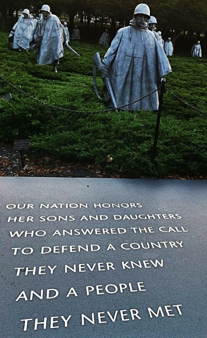 그래서 워싱턴 DC에 있는 한국전쟁기념관(Korean War Veterans Memorial)에 쓰여있는 문구가 주는 묵직함이 가슴을 누른다. "FREEDOM IS NOT FREE(자유는 공짜가 아니다)"와 "OUR NATION HONORS HER SONS AND DAUGHTERS WHO ANSWERED THE CALL TO DEFEND A COUNTRY THEY NEVER KNEW AND A PEOPLE THEY NEVER MET (전혀 알지도 못하는 나라, 한 번도 만난 적이 없는 국민을 지키라는 국가의 부름에 응한 그 아들, 딸들에게 경의를 표합니다)"라는 문구다.
