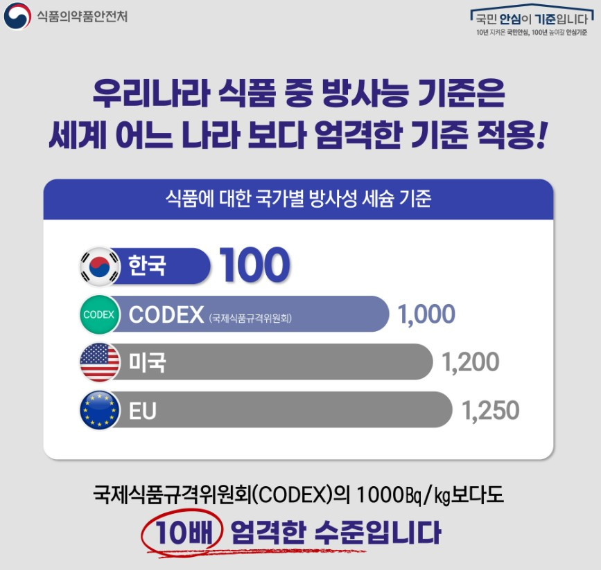 이 기준은 세계 어느 나라보다 엄격한 잣대다. 미국은 방사성 세슘 허용치 기준이 1,200Bq/kg이고 유럽 EU는 1,250Bq/kg이다.
