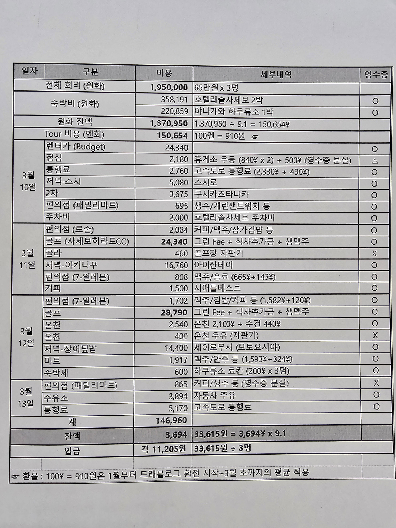 먼저 지난 주말인 3월 10일(일) ~ 13일(수), 3박 4일 일정으로 일본 규슈 쪽으로 골프여행을 다녀왔다. 퇴직하신 직장 선배님 2분이랑 같이 1/n로 65만 원씩을 회비로 냈다. 정산하고 11,000원 정도를 돌려받았으니 공식적으로 64만 원이 들었다. 이 비용에는 항공료와 개인별 쇼핑비용이 빠져 있다. 후쿠오카 왕복 항공료 78,200원과 여행자보험 42,200원, 공항버스 왕복 36,000원, 그리고 일본에서 쇼핑한 소화제, 근육통 파스, 기타 젤리, 과자, 카스텔라, 기념품을 사느라 든 20만 원을 포함하면 356,400원이 더 추가되어야 한다. 그러면 총비용이 996,400원이 들었다. 항공사 직원이라 항공료가 10만 원도 안 되는 비용이 들었음에도 그렇다. 물론 이틀간 골프를 친 비용이 들어 조금 비싼 듯 하지만 골프장 그린피 및 카트비, 캐디피(캐디 신청 안 함), 식사비용 포함하여 1인당 대략 8만 원 정도밖에 안 든다. 골프비용은 한국에 비하면 1/3 가격밖에 안 들었다.