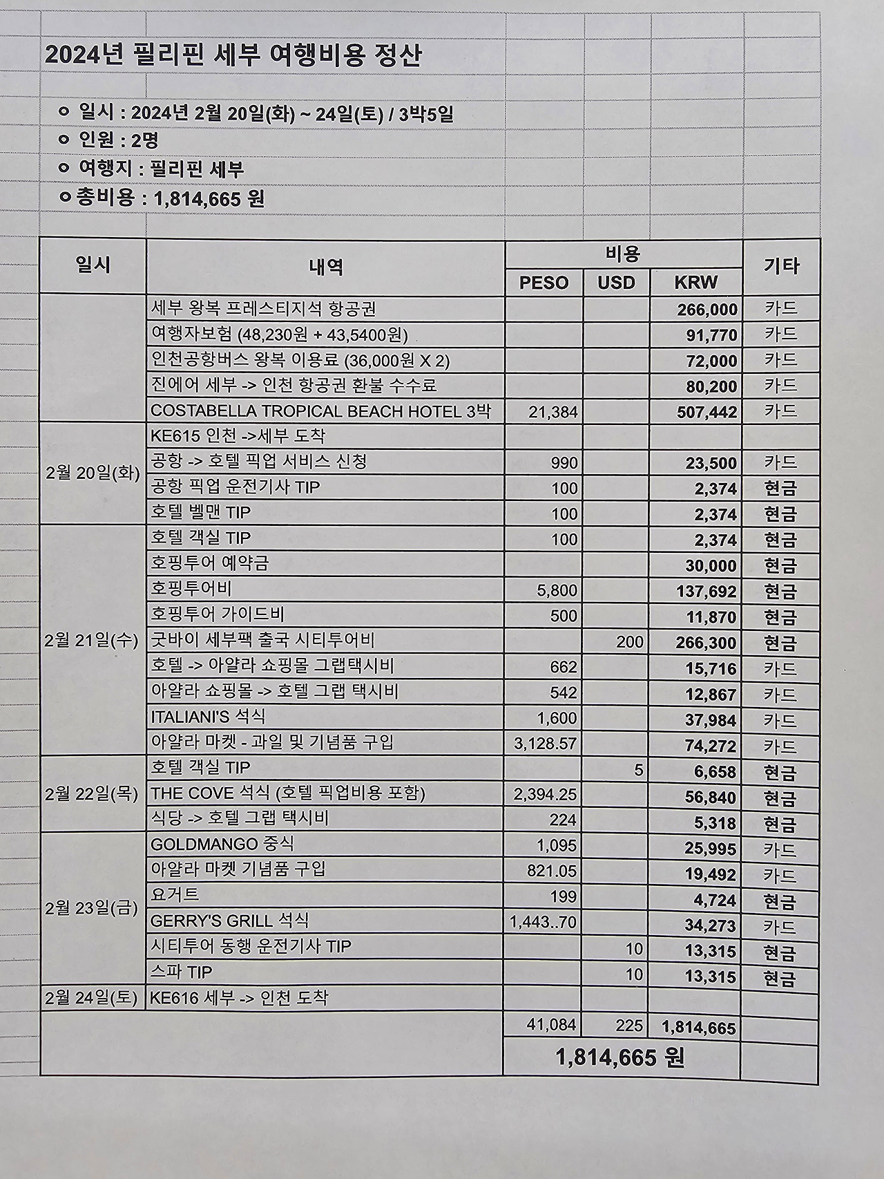 지난달 2월 20일(화) ~ 24일(토) 3박 5일 일정으로 와이프와 둘이서 다녀온 필리핀 세부여행 비용을 보자. 총 180만 원 정도를 썼다. 1인당 90만 원 정도 쓴 것이다. 여행일정이 임박한 일주일 전에 리조트 예약을 한 관계로 숙박비가 3일에 50만 원 수준으로 조금 비싸게 잡히긴 했지만 리조트 치고는 가성비 있는 숙소였다. 호핑투어 비용과 스파, 시티투어 비용 등이 전체 비용에서 큰 비중을 차지하고 있지만 그 정도는 당연히 치러야 하는 비용으로 볼 수 있다. 동남아도 역시 1인당 100만 원 정도 들었다고 보면 된다.