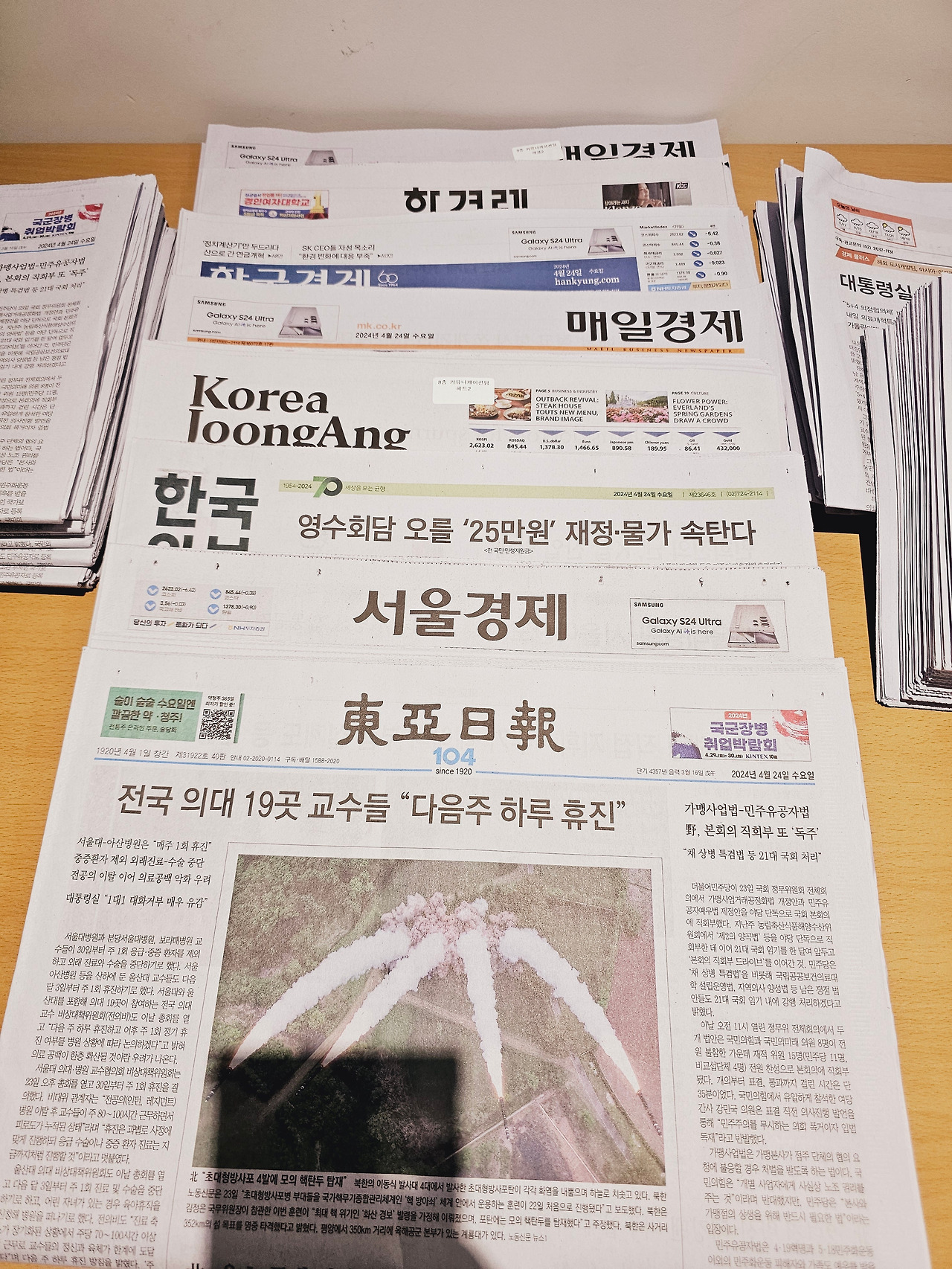 근무하고 있는 부서가 커뮤니케이션실이다 보니 매일 아침 종이신문을 모두 일견 하게 됩니다. 국내에서 발행하는 종이신문은 모두 볼 수 있습니다. 사무실 입구 책상 위에 산더미처럼 쌓여 있습니다. 당직자들이 매체별로 한 부씩 정리해 놓고 나머지는 그냥 쌓아놓습니다. 출근하는 순서대로 선호하는 신문들을 하나씩 집어갑니다. 남겨진 신문들을 보면 직원들의 매체 선호도를 대충 알 수 있습니다.