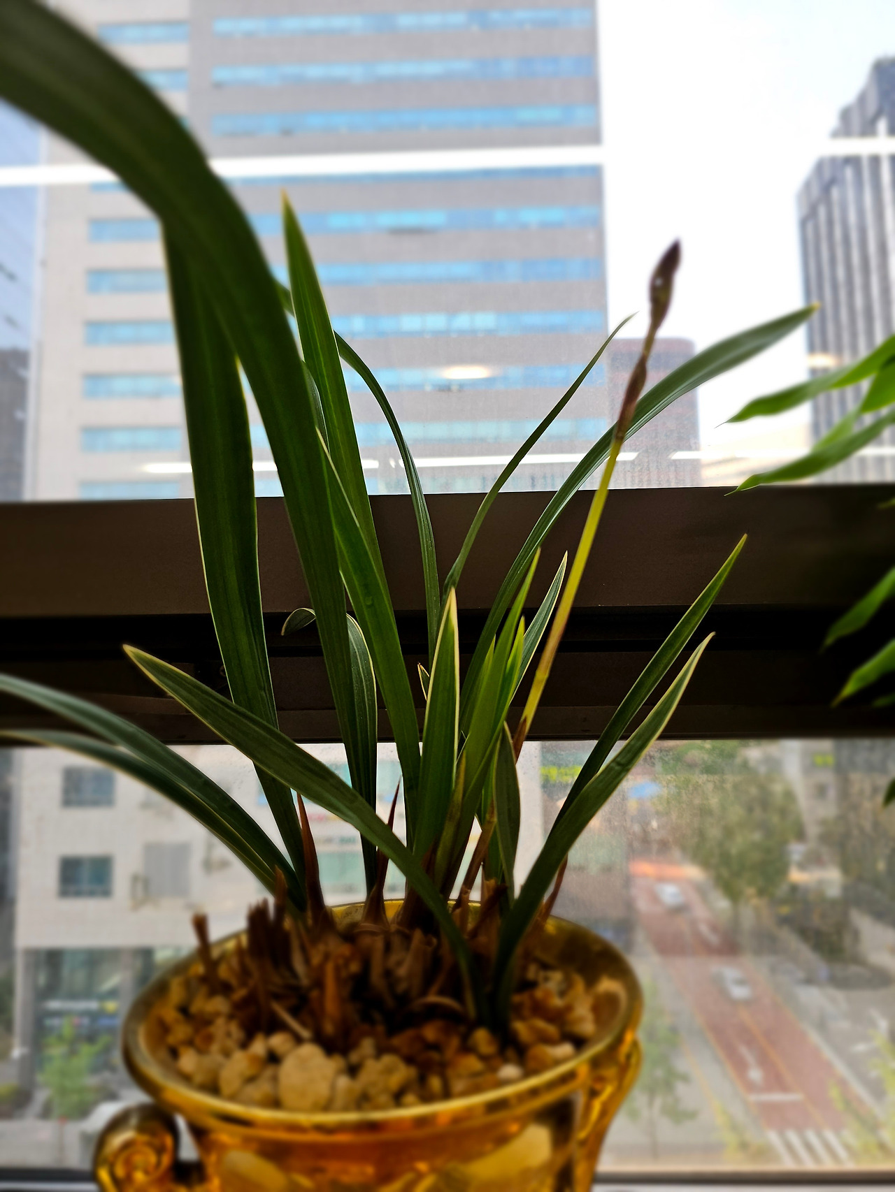 사무실 책상 뒤쪽 창가에 놓인 난(蘭)중의 하나가 꽃대를 올린 것입니다.