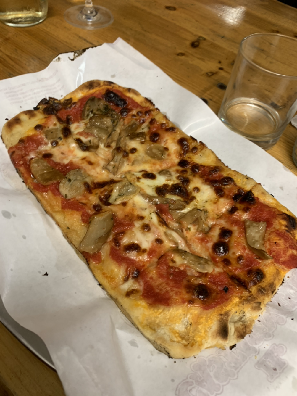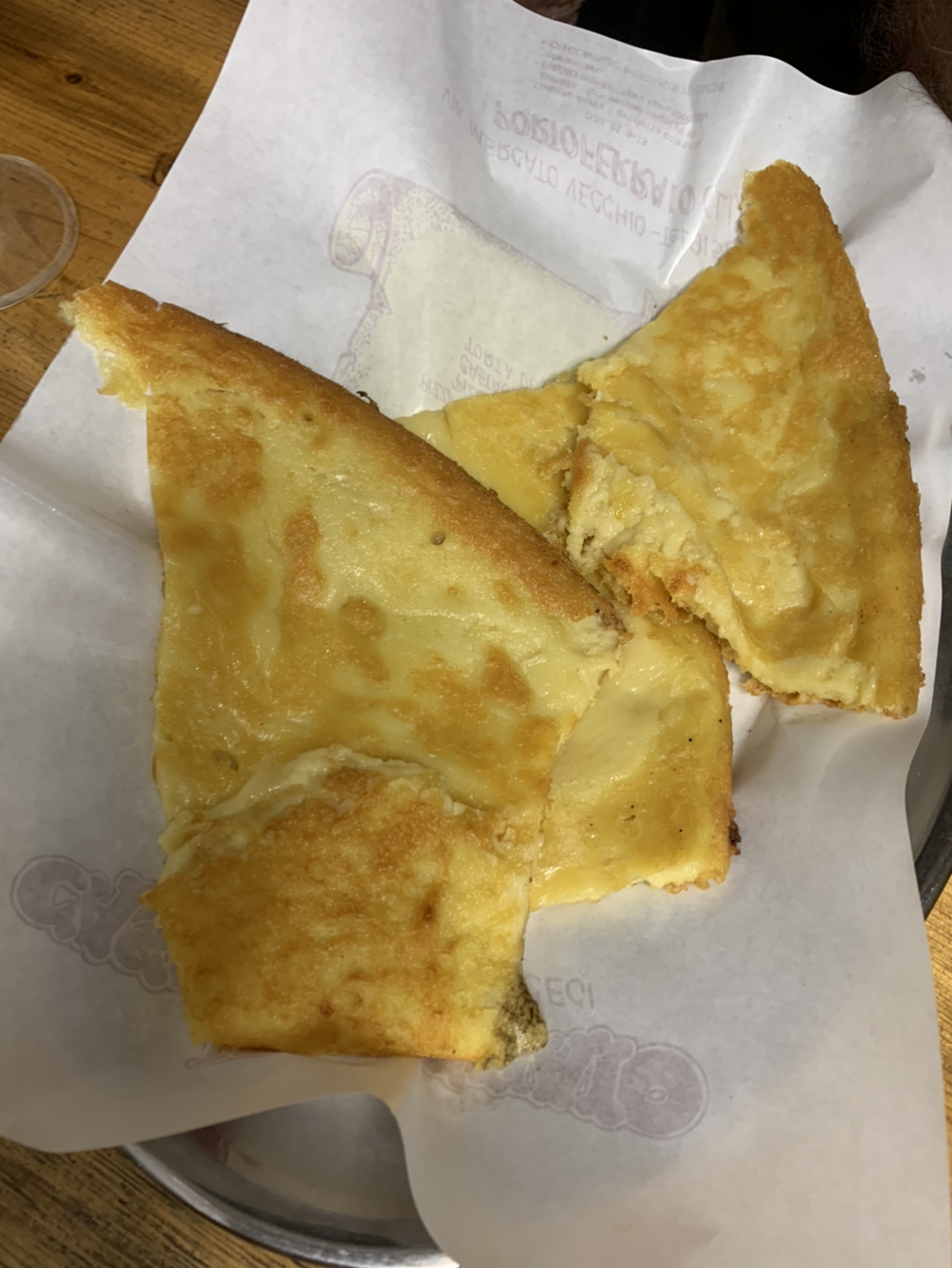 이 파리타나 피자는 토스카나 지역의 피자로, 병아리콩(Chickpea)을 갈아 올리브 오일과 물을 넣어 반죽하여 구워 낸 피자다. 생김새는 너무도 녹두전과 비슷해 보여 시각적으로 한번 놀란다. 콩으로 만들었다는 말에 맛도 혹시나 비슷할까 기대를 했다. 주문하고 20분 정도를 기다려, 조각조각 투박하게 찢어진 따끈따끈한 파리나타를 받았다. 포크와 나이프를 이용 해 얼른 잘라서 한입에 쏙 넣어 보았다.