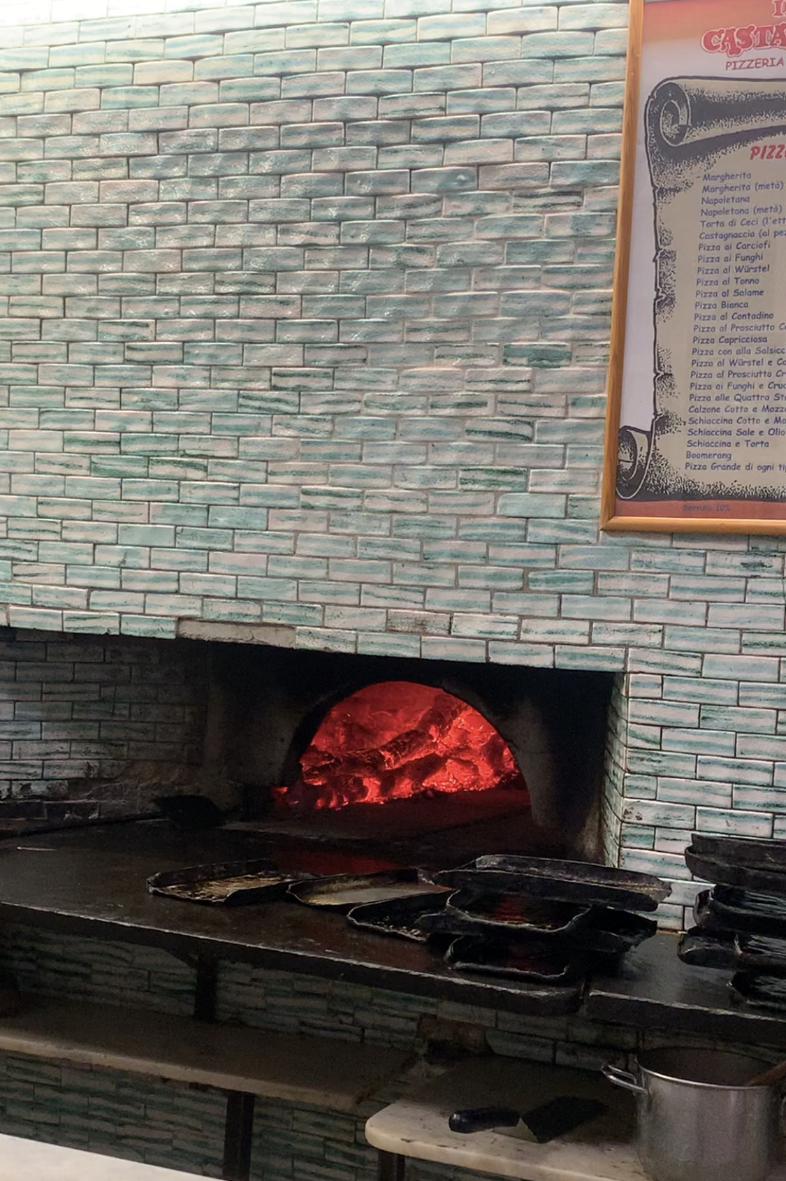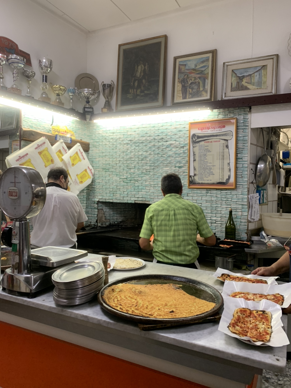피자리아 입구에서부터 숯이 시뻘겋게 이글이글 대는 큰 화덕이 보였다. 그리고 그 화덕 앞에는 갓 요리한 '직사각형' 모양의 피자들이 나오고 있었다. 그리고 직사각형 모양의 피자접시들 옆에는 꽤 거대한 지름 50 센티는 되어 보이는 노릇노릇한 토마토소스가 없는 빈대떡 같은 모양을 한 피자가 눈에 띄었다. 바로 친구들이 설명했던 '파리나타' 다.