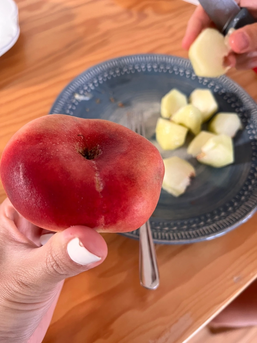 하지만 바로 한 달 반 뒤, 7월 말의 납작 복숭아는 그 맛이 180도로 바뀌었다. 리스본에 놀러 온 나의 여동생도 납작 복숭아를 보더니, 본인도 한번 먹어 보겠다며 맛있어 보이는 놈을 장바구니에 담았다. 이 모습은 흡사 어디서 본 것을 재현하는 듯한 느낌인데, 바로 한 달 전 지혜의 모습과 겹쳐져 보였다.