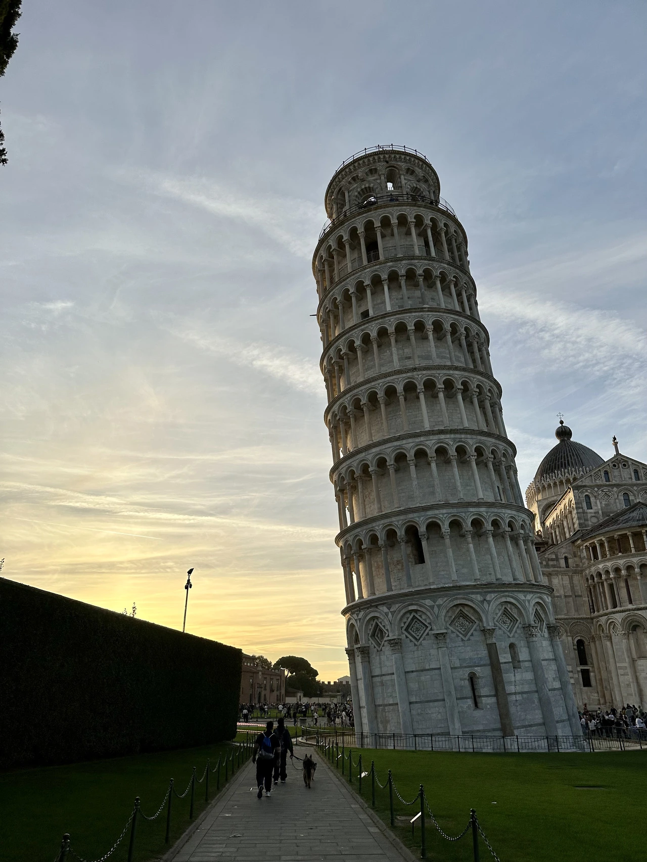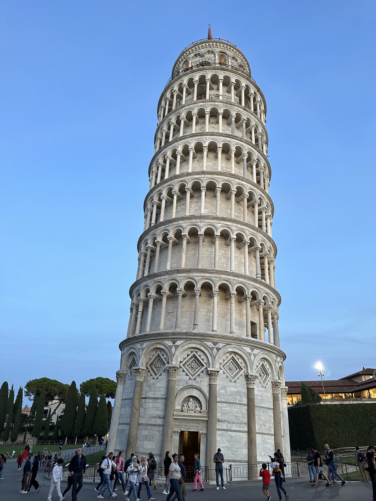 어느새 어둠이 깔리고, 차로 돌아갈 시간이 되었다. 오래 보고 있다 보면 수평감각에 혼란을 주는 피사의 사탑의 사진을 마지막으로 남겨봤다. 피사의 사탑은 수많은 보수를 거쳐 무너질 가능성이 아주 적어졌다고 한다. 다만 보수공사가 너무 잘 되어 바로 서고 있는 것이 문제라면 문제라고. 피사의 사탑이 온 세상의 다른 건물들을 따라 수직으로 서는 날이 올지도 모르겠다. 피사의 사탑이 아직 당연하게 기울어져 있을 때 보러 올 수 있어 다행이었다.