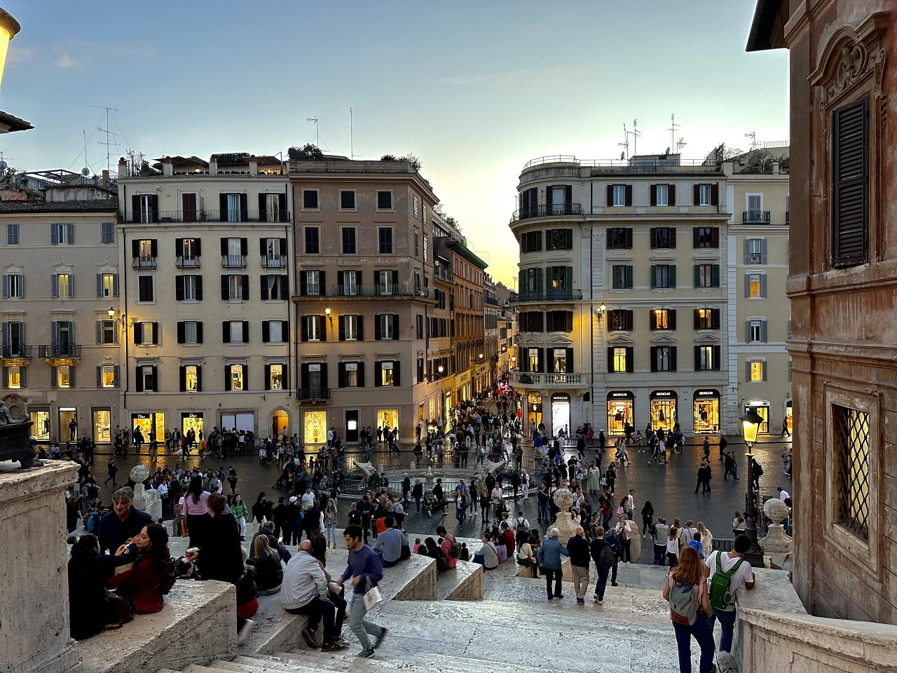 다음으로 향한 곳은 스패니쉬 계단이었다. 로마의 휴일에서 오드리 헵번이 젤라토를 먹은 바로 그 장소였다. 해질 무렵 가장 아름답다는 호텔의 말을 듣고 시간을 맞춰 왔더니 계단은 이미 많은 사람들로 북적이고 있었다. 우리도 난간 한 구석을 차지했다. 붉게 물드는 하늘과 대비되어 상점에서 흘러나오는 노란 불빛이 밝게 빛났고, 사람들은 그 주변을 서성이며 느긋하게 시간을 보내고 있었다. 이태리에서의 마지막 밤을 하루 앞둔 날이었다. 선뜻 내려갈 마음이 들지 않아 한참을 머물며 도시와 사람을 구경했다.