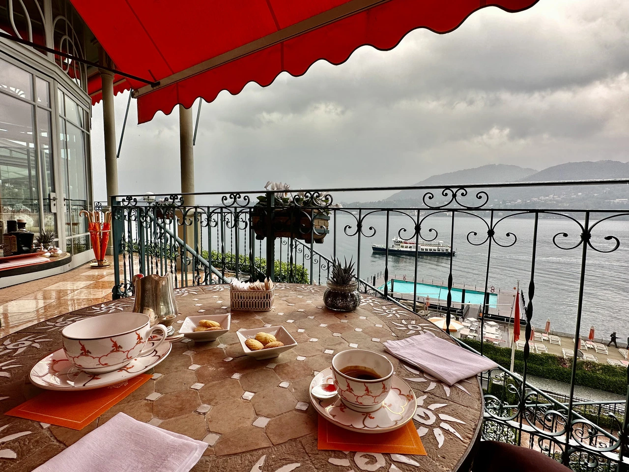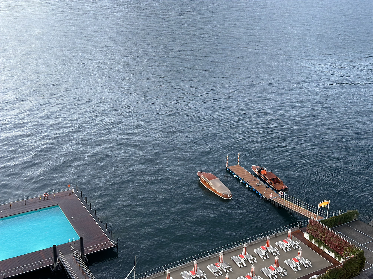꼬모호수를 첫 번째 행선지로 정한 건 11월에 시작한다는 비수기를 피하기 위함이었다. 동선을 전략적으로 짰다고 좋아하며 밀라노 공항에서 2시간 가까이 차를 타고 온 우리를 맞이한 건 당장이라도 장대비를 뿌릴 것 같은 시커먼 먹구름이었다. 우리가 그 먼 길을 달려온 것은 눈이 시릴 만큼 파란 하늘과 그 하늘을 담은 호수 꼬모호수를 위한 것이 아니었던가. 실망은 거기서 멈추지 않았다. 90년이 넘는 세월 동안 "that happy, sunny place"로 명성을 알린 호텔도 먹구름 아래에서는 제 힘을 발휘하지 못했다. 반짝이는 호수와 완벽한 조화를 이루는 오렌지 빛 파라솔, 쨍한 노란색 건물의 호텔, 머릿속에 수십 번을 그려 그대로 각인이 되어버린 이미지는 그렇게 물거품이 되어 사라져 버리는 듯했다.