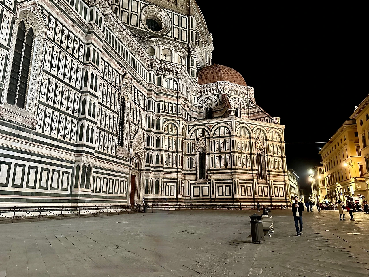 그렇게 우연히 발견한 레푸블리카 광장을 뒤로하고 몇 걸음을 채 옮기지 않아 거대한 건물의 한 귀퉁이가 눈에 들어왔다. 그게 피렌체 대성당이라는 것을 깨달은 것은 어둠 속에서도 선명하게 새하얀 벽이 눈에 들어온 뒤였다. 한눈에 담을 수 없을 정도로 거대한 벽면을 장식한 굵은 초록색 선은 마치 종이에 그려져 세워진 것 같은 착시 현상을 불러일으켰다. 어디서도 본 적 없는 오묘한 광경이었다. 깜깜한 밤에 처음으로 마주한 피렌체 대성당의 존재는 그렇게 주변을 압도하고 있었다.