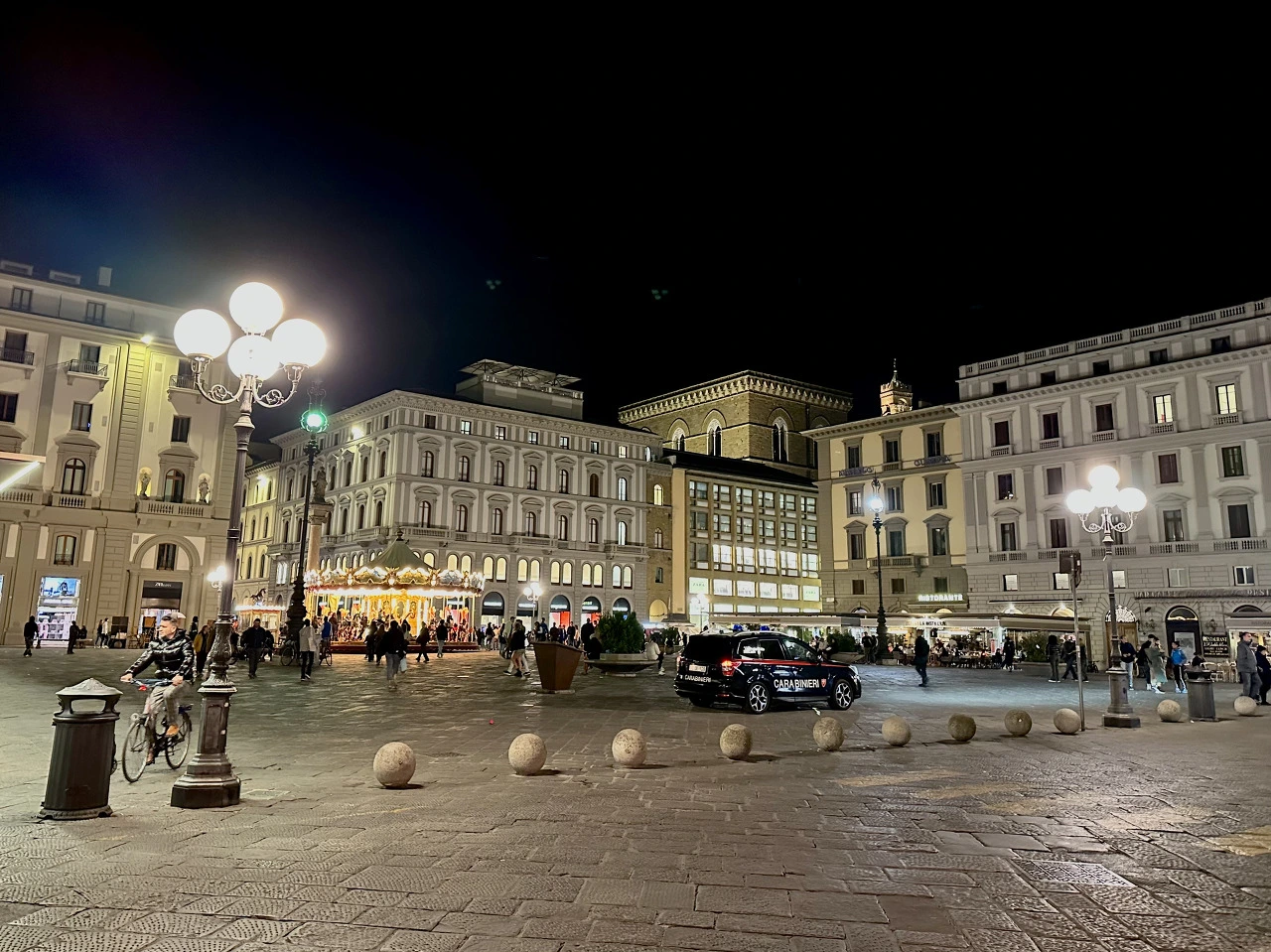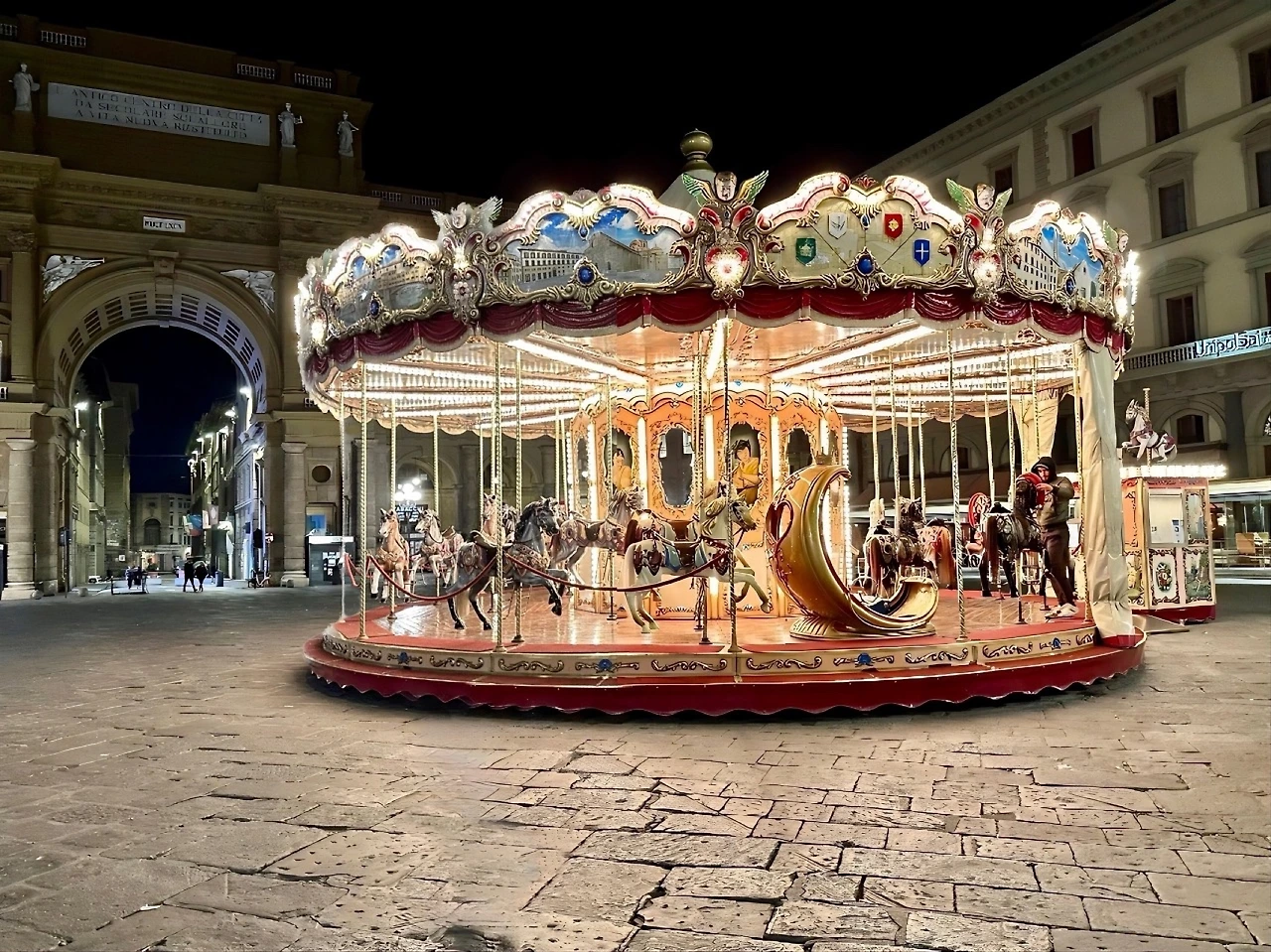 눈에 제일 먼저 들어온 것은 회전목마였다. 사진을 통해 익숙해진 모습 그대로 광장 한켠을 밝히고 있는 회전목마의 느닷없는 등장에 반가운 마음이 들었다. 이후 피렌체에서 시간을 보내며 현대와 중세, 현실과 동화 속을 넘나드는 것 같은 순간이 여러 번 있었는데, 가장 예상하지 못한 곳에 있으면서도 그 자리에 꼭 어울리는 회전목마는 이 도시에 너무도 잘 맞는 상징물이 아닌가 생각한다.
