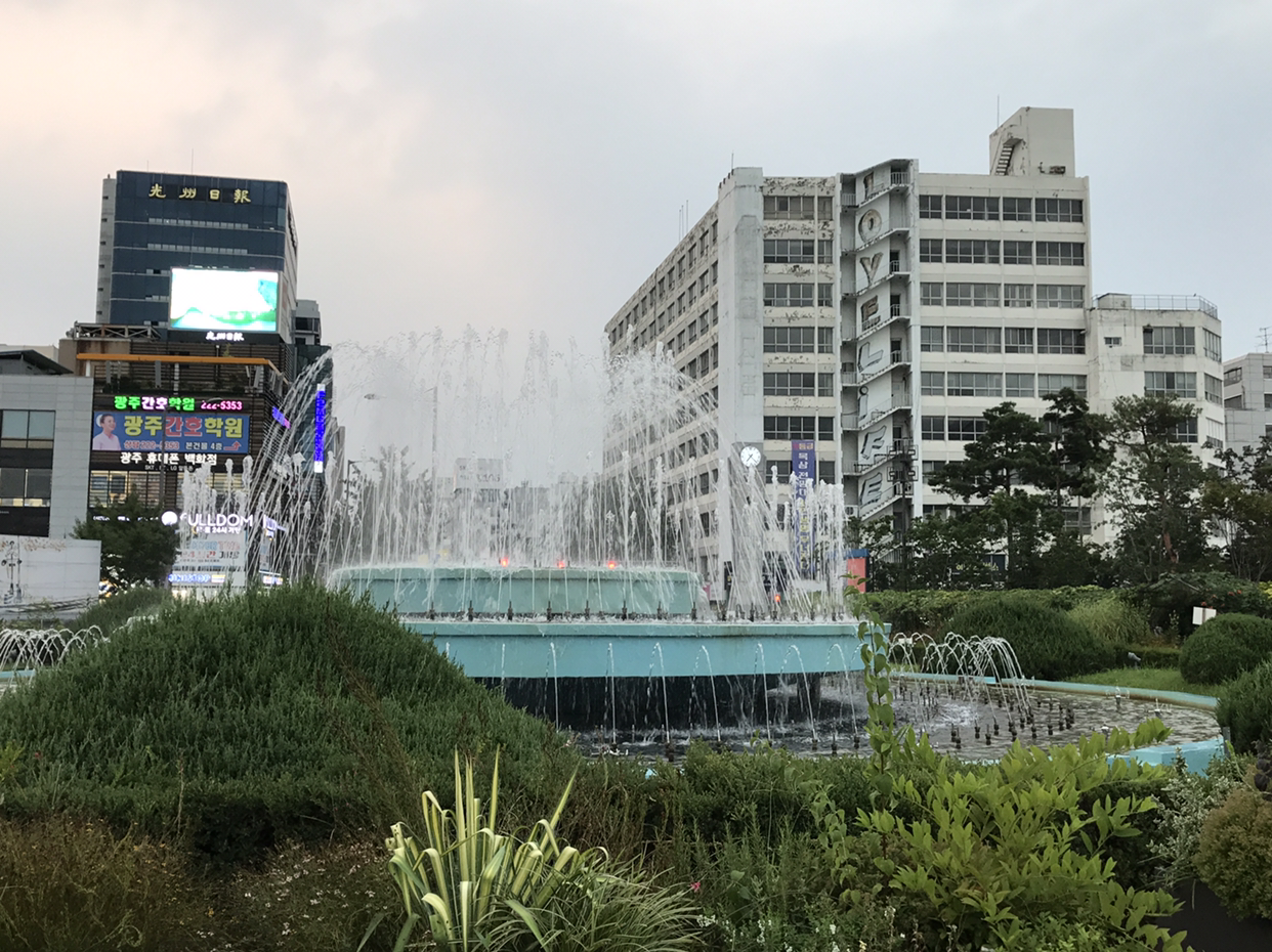 전일빌딩 맞은편에는 YMCA 건물이 있다. 분홍색 촌색시처럼 울긋불긋한 그림이 그려진 YMCA 빌딩도 영화 속에서 사람들이 구호를 외치며 지나치던 모습 그대로 남아있다. YMCA 빌딩을 지나서 횡단보도를 건너가면 옛 전남도청과 그 중앙의 분수대가 보인다.