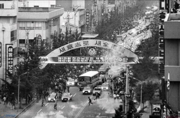 민주항쟁의 한 복판에서 꽃 같은 학생들과 서슬 퍼런 계엄군의 팽팽한 대치를 남김없이 지켜보았던 분수는, 세월이 흘러 낡고 녹이 슬었지만 여전히 아름다운 왕관 모양의 물줄기를 빚어 올리며 고풍스러운 멋을 풍겨내고 있었다.