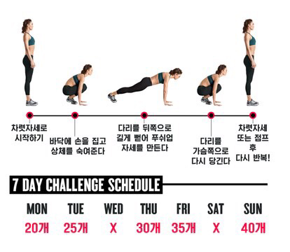 군대에서 하는 유격 훈련과 비슷한 버피 테스트는 장기간 유산소 운동을 하기 힘든 현대인들에게 안성맞춤이다. 짧은 시간안에 확실한 운동효과를 내어서 복부의 지방을 연소시키는 동시에 근력을 키워 스테미너 지수를 올려 준다.