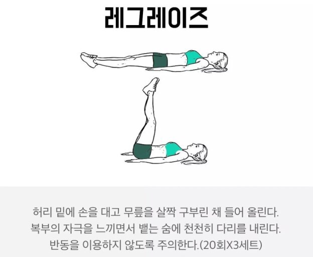 하복부를 자극하여 복근을 고루 발달시키는 이 운동은 중년남성들처럼 쿵푸팬더형 비만인 사람에게 좋은 운동이다. 단, 근력이 떨어지면 허리가 나갈 수 있으므로 앞의 운동들로 충분한 체력과 근력을 다진 후에 실시하도록 한다.