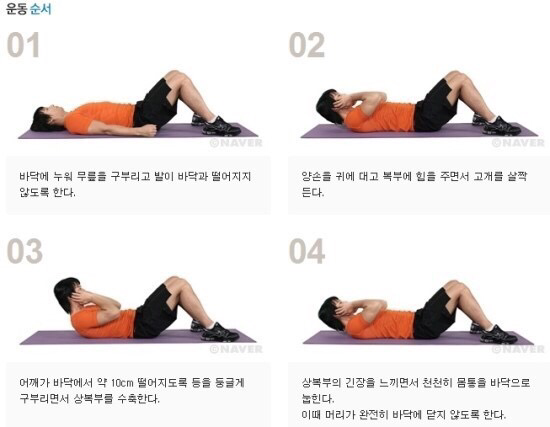 복부 윗부분을 강화하는 운동이다. 윗몸 일으키기와 비슷하지만 상체를 다 세우지 않고 어깨까지만 일으킨다. 복부에 온 힘을 집중하는 것이 포인트.