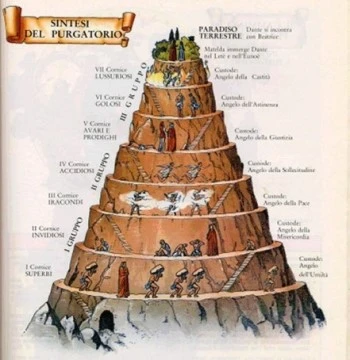 ‘연옥’편에서는 남반구 큰 바다의 고도 한가운데 높이 솟아 있는 암석 봉우리 일곱 개가 나온다. 각 봉우리에는 죄를 씻고 정결함을 구하고자 하는 사람들이 오만, 질투, 나태, 탐욕, 애욕을 정화하며 정진하여 자유롭고 티 없는 깨끗함을 구하고자 한다.