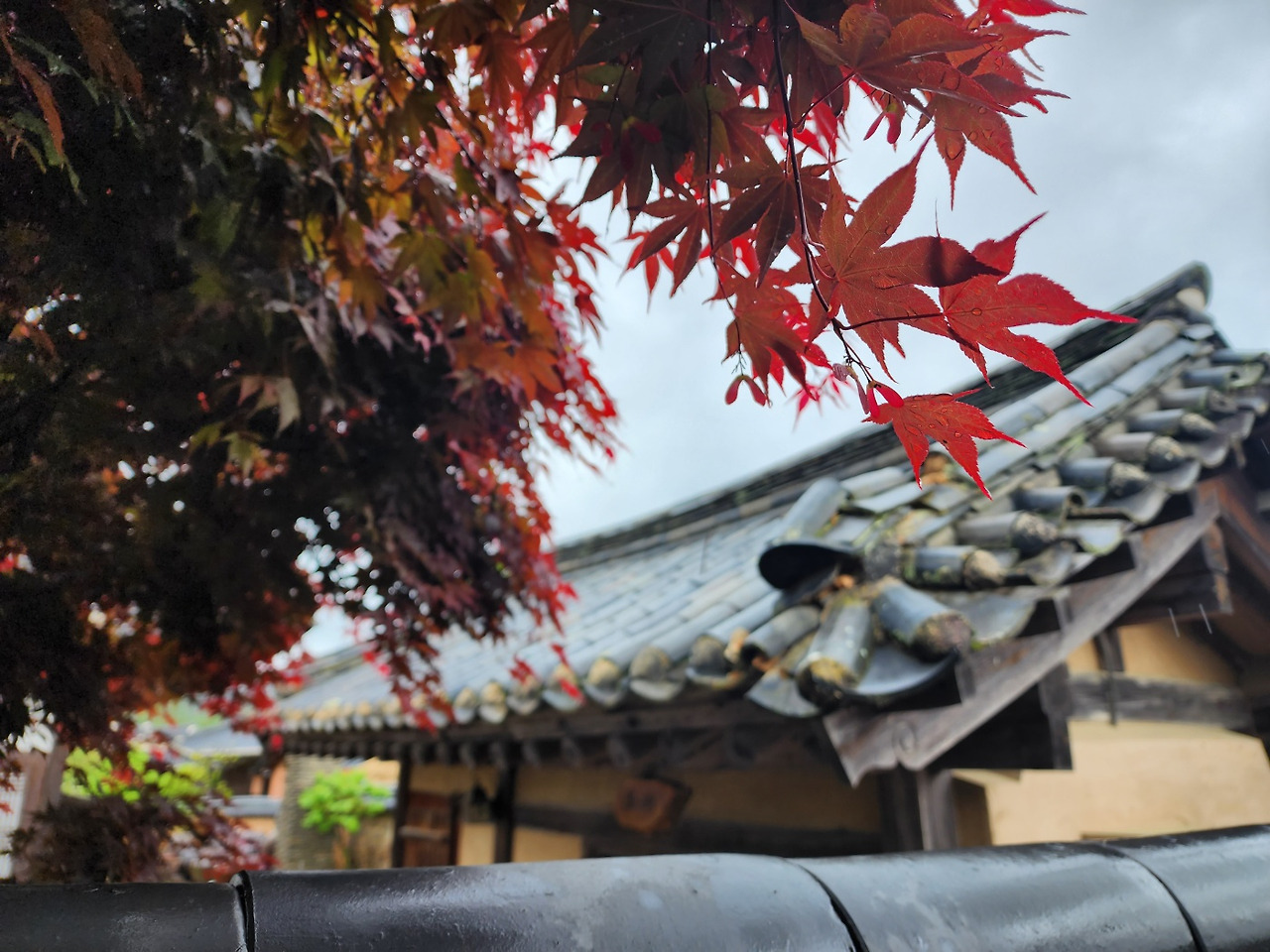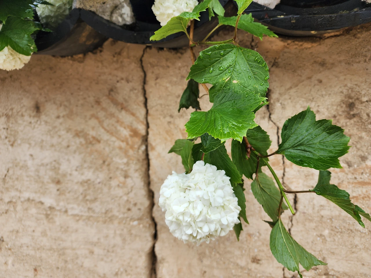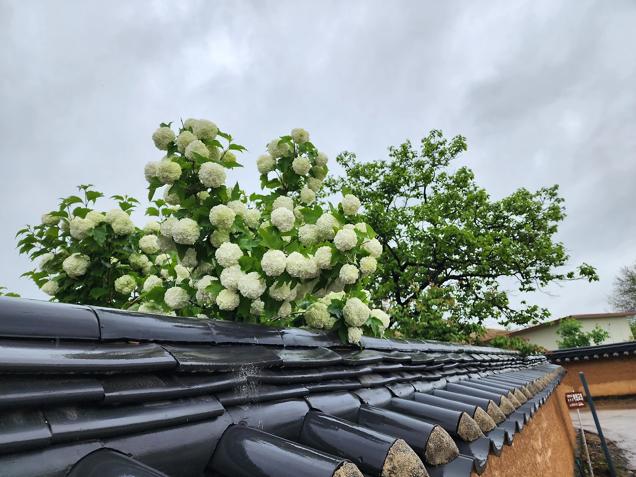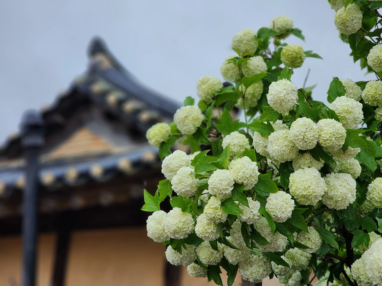 비 오는 안동 하회마을 풍경은 기대 이상 멋스러웠다. 우린 두 개의 우산 중 하나를 접고 같은 우산을 쓰고 걸었다. 그러다 꽃을 만나면 나는 우산 속을 뛰쳐나와 사진을 찍었다. 어느새 다가온 남편의 우산 아래에서 나는 꽃을, 남편은 나를 사진에 담았다. 한참 사진을 찍고 나서야 걸음을 옮겠다. 비가 오는 싱그러운 5월의 하회 마을의 매력에 빠져 최대한 천천히 하회마을 주민이 600년을 살아온 흙길을 걸었다. 기와지붕 아래로 떨어지는 빗방울에 홀려 고개 든 순간, 흙벽 아래로 흘러나온 불두화와 눈이 마주쳤다. 아, 신음처럼 환호성이 터져 나왔다. '아름답다는 표현을 세련되게 할 순 없을까?' 머리를 이리저리 굴려도 달리 표현 방법이 떠오르지 않았다.
