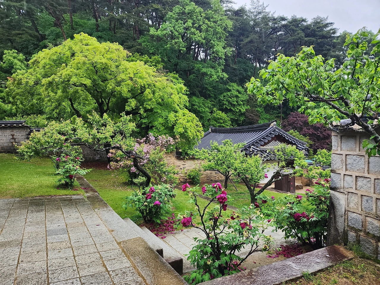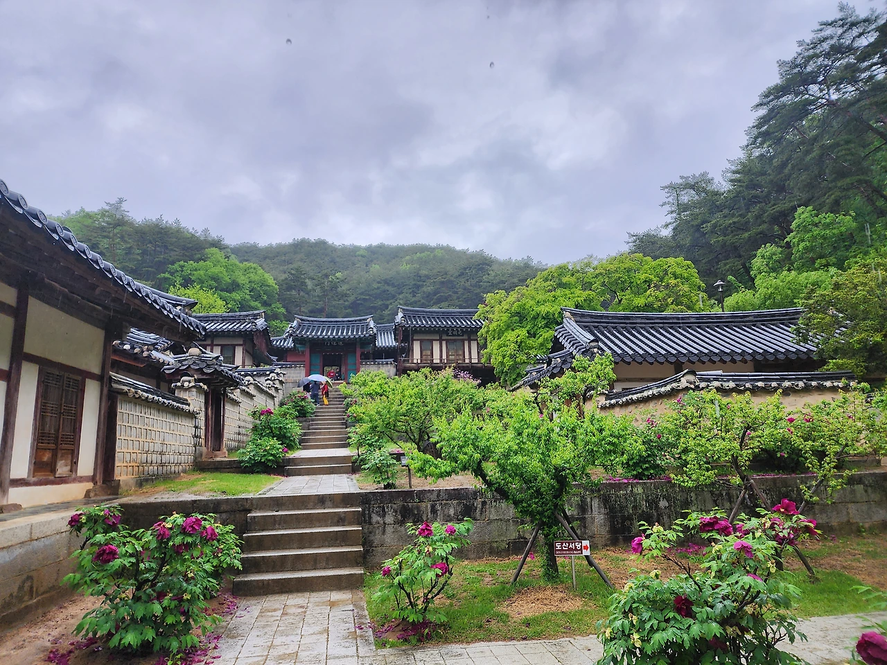 비가 와 그윽한 풍취를 느끼게 했던 하회 마을 여행이 끝나 도산서원으로 차를 돌렸다. 퇴계 이황의 학문과 덕행을 기리고 추모하기 위해 1574년에 지어진 도산서원은 두 번째 방문이다. 이때서야 뒤늦게 안동을 2년 전에 방문했음을 알았다. 저질 기억력이라며 그와 웃었다. 처음 방문했을 때는 매화가 피었을 시기였고, 오늘은 연둣빛이 찬란하게 피어나는 비 오는 봄날이다. 매화 대신 작약이 흐드러지게 피어 있는 도산서원은 고상함 대신 발랄한 활기가 느껴졌다. 같은 장소 다른 멋이다.
