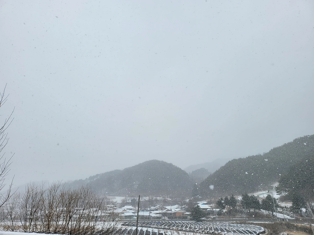 산을 내려와 숙소에 묵으면서도 덕유산 설경을 보지 못한 점은 못내 아쉬웠다. 아쉬움 때문이었을까? 밤새 뒤척이다 새벽을 맞았다. 암막 커튼을 올리자 눈 내린 논과 밭이 거짓말처럼 펼쳐졌다. 그토록 소원하던 눈이 밤 사이 내렸다니 꿈인가 싶었다. 눈 쌓인 들판을 바라보자 눈 내리는 풍경을 보고 싶다는 욕망이 생겼다. 바람이 통한 걸까? 함박눈이 쏟아지기 시작했다. 먹구름이 하늘을 가득 메우고 난 후다. 창문을 열어 눈을 만지며 환호했다. 옆에서는 나와 달리 그이는 외진 산골 도로는 눈길이 얼면 위험하다며 걱정이다. 남편의 말을 흘러들으며 마음속으로 제발 흰 눈이 펑펑 쏟아지길 빌었다. 점점 눈발이 굵어지고 있다.